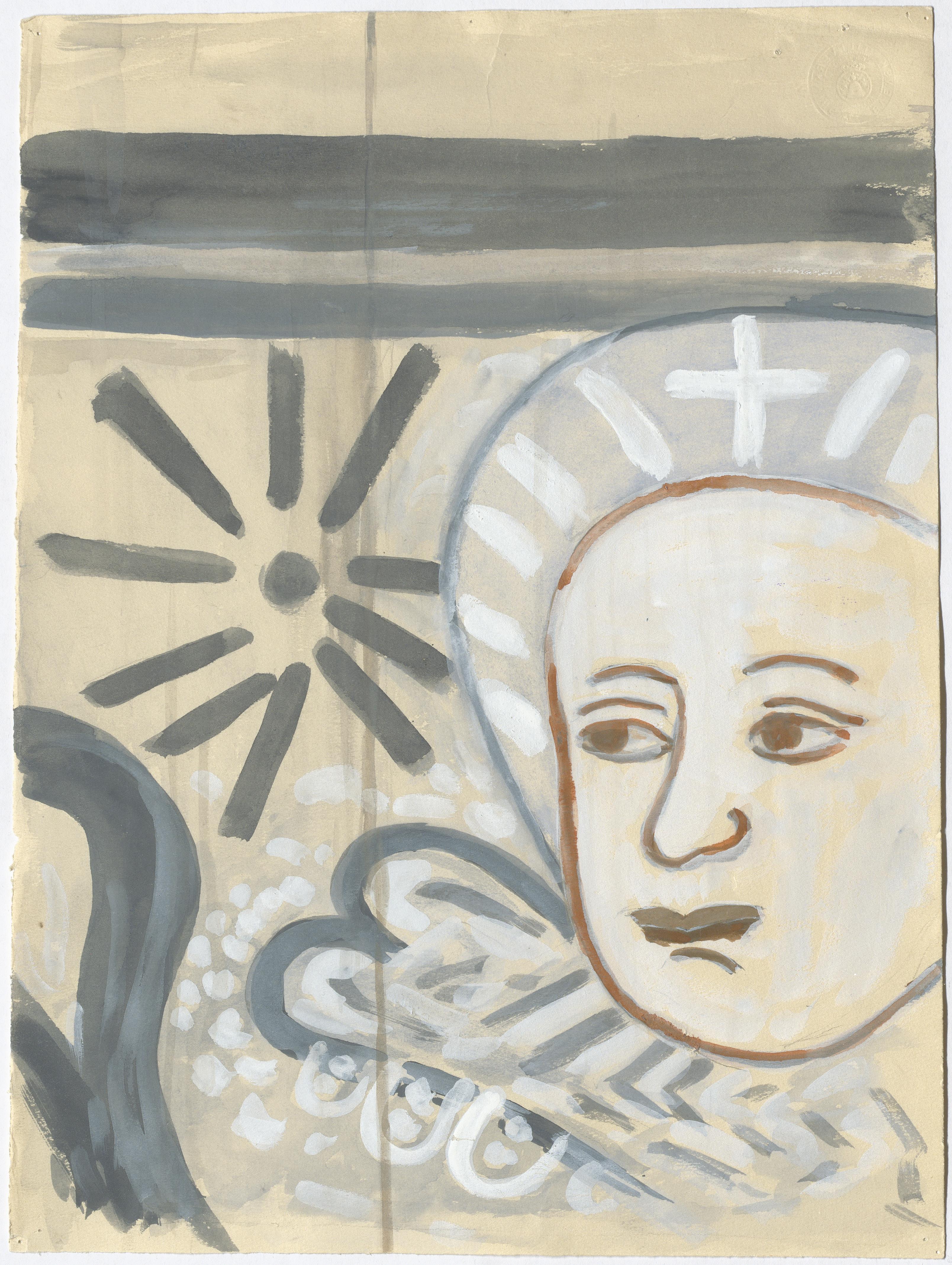 Beskrivning: Rester av måleri på trä från den äldre kyrkan från 1500-talet. Ansikte av en människa eller ängel. Akvarell av Hanna Jonsson 1936.