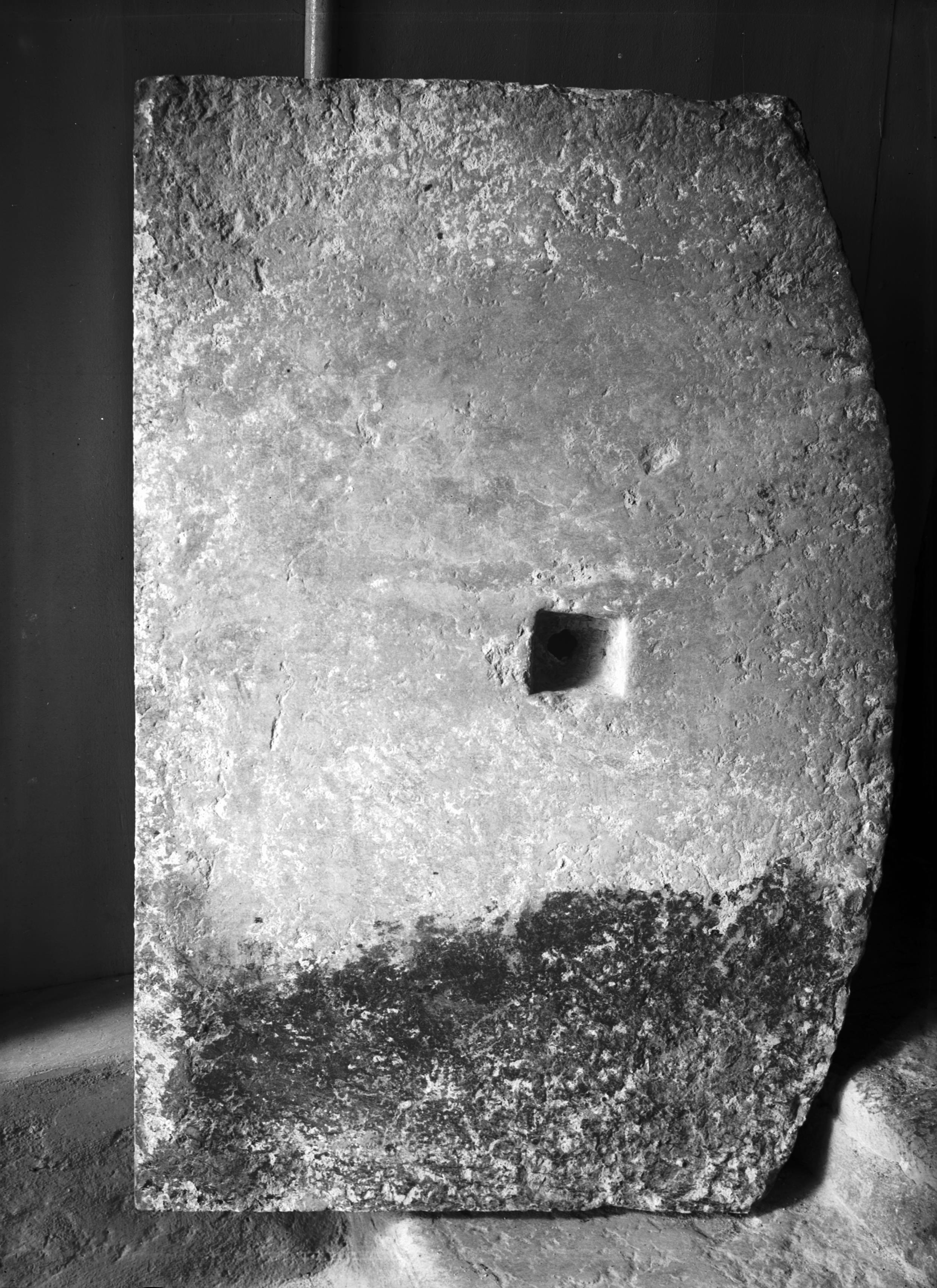 Beskrivning: Häll med relikgömma från altare i södra korsarmens absid.