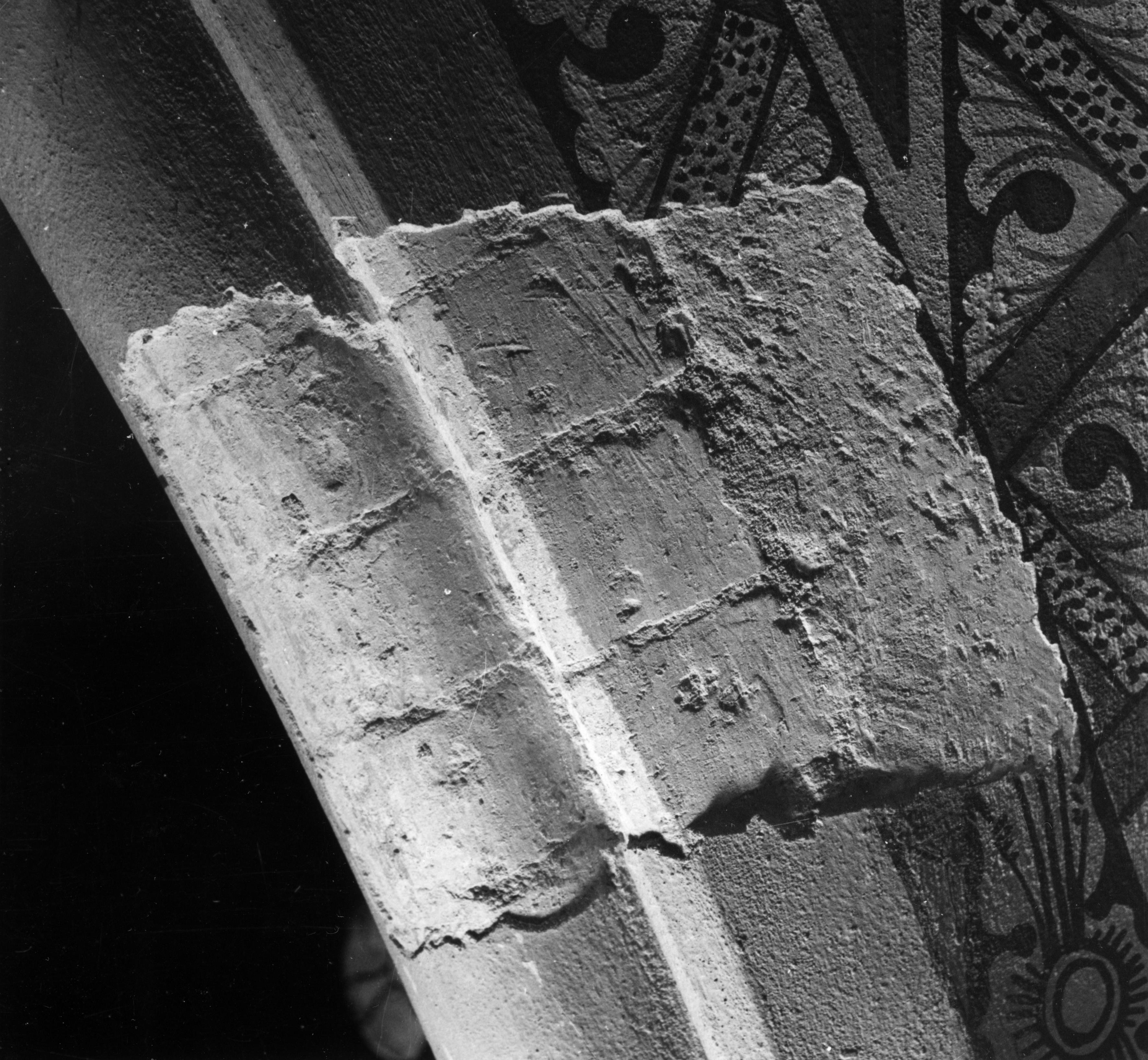 Beskrivning: Bilaga till restaureringsförslag av domkyrkoarkitekten Åke Porne, Uppsala, mars 1967. Punktvisa undersökningar av puts. Norra kapellsviten. Koromgången. Valv 13. Östra valvkappan. Nordöstra svickelbenet med diagonalribba.
