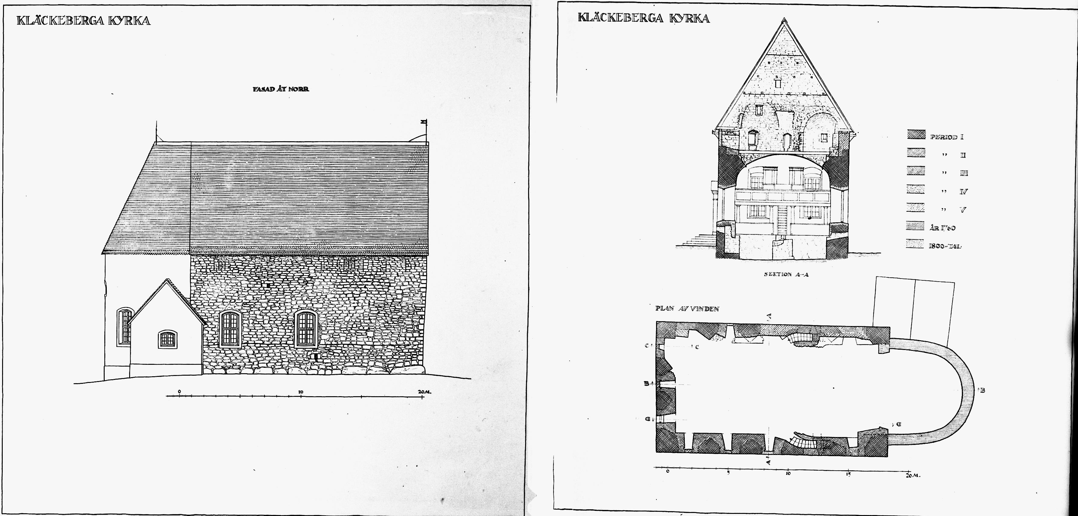 Beskrivning: Teckning över kyrkan med planritning och genomskärning.