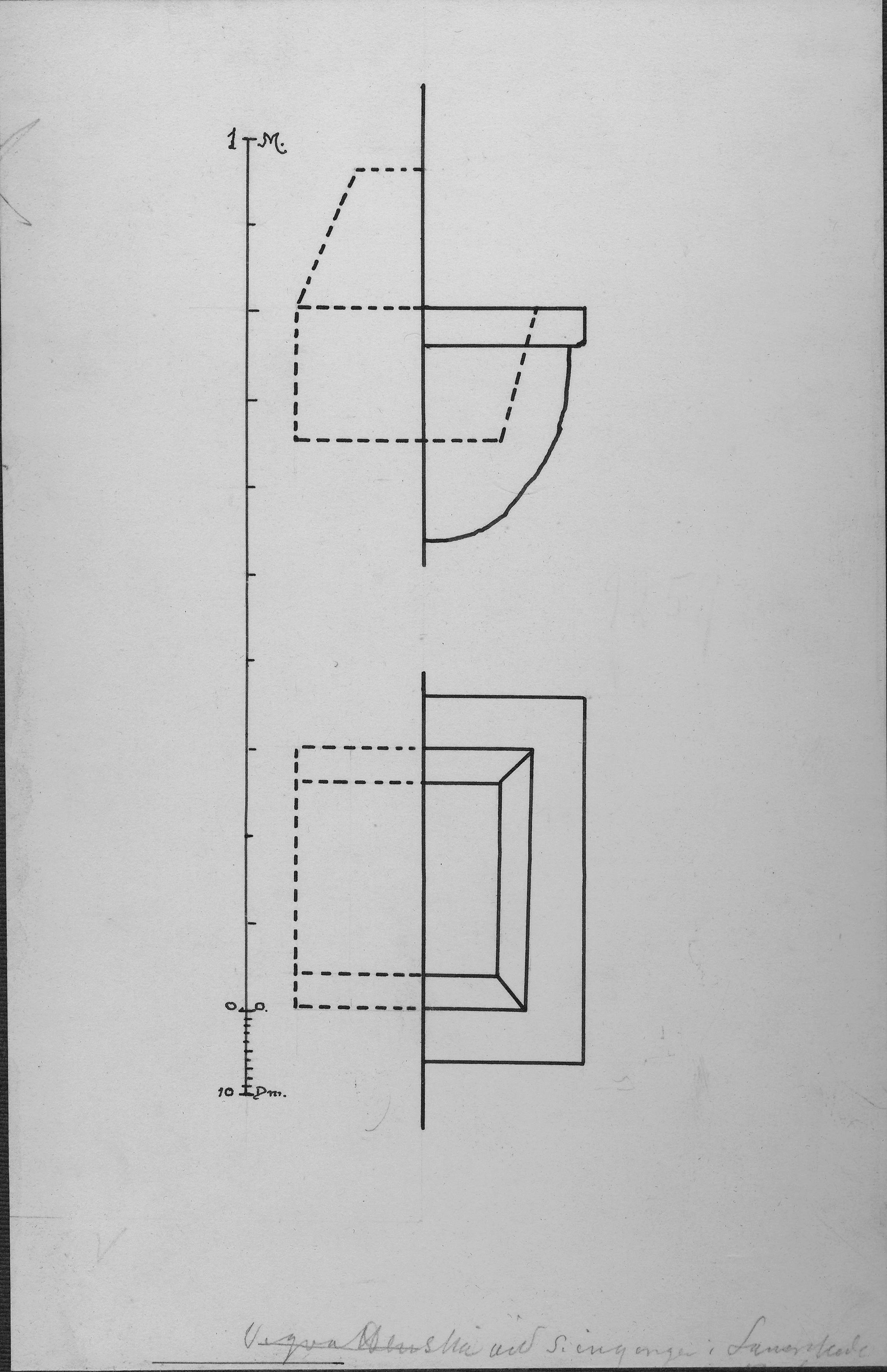 Beskrivning: Vigvattenskål på väggen vid södra ingången. Teckning med måttangivelse.