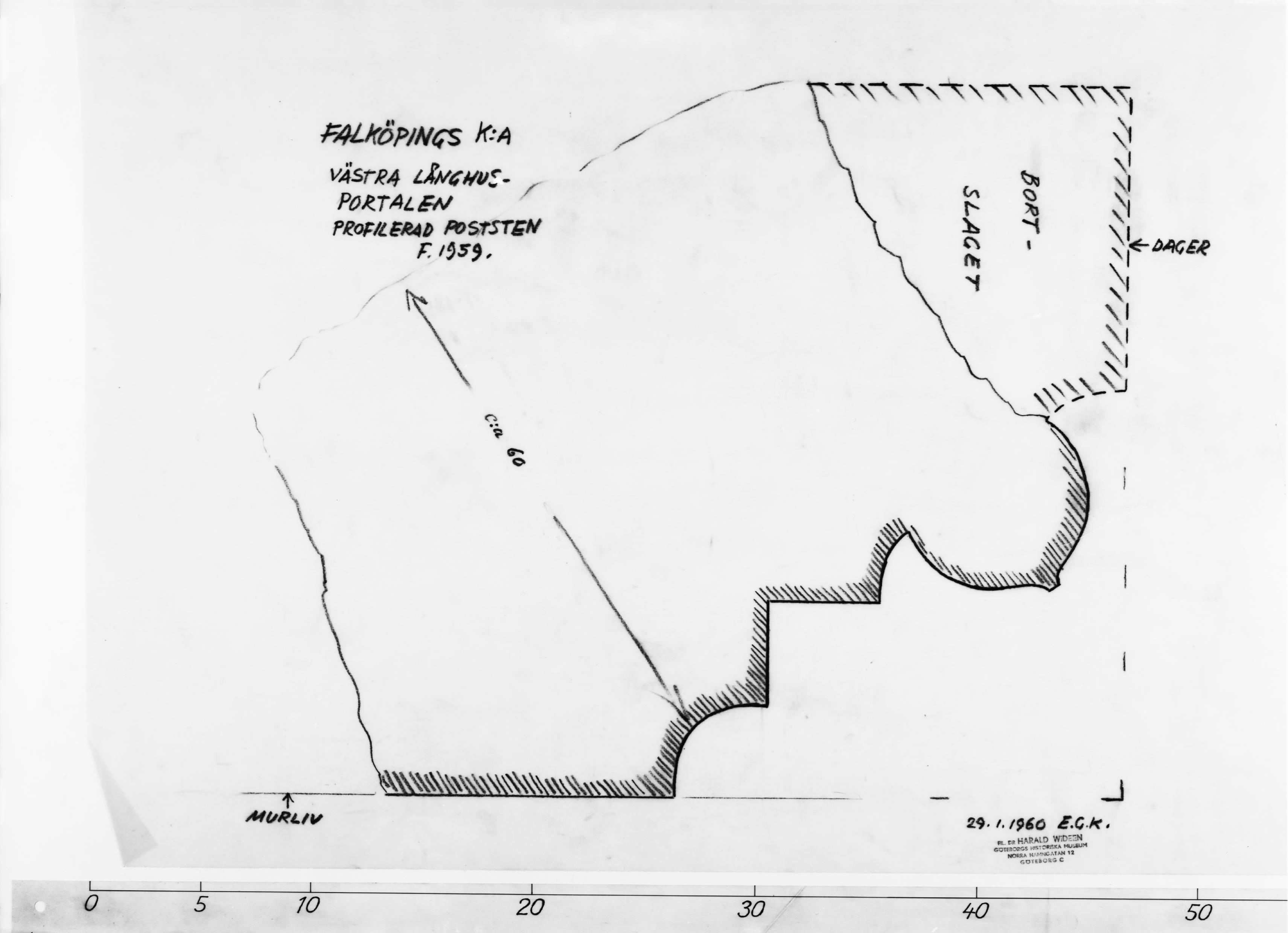 Beskrivning: Foto efter skiss av skulpturfragment av sten, profilerad poststen.