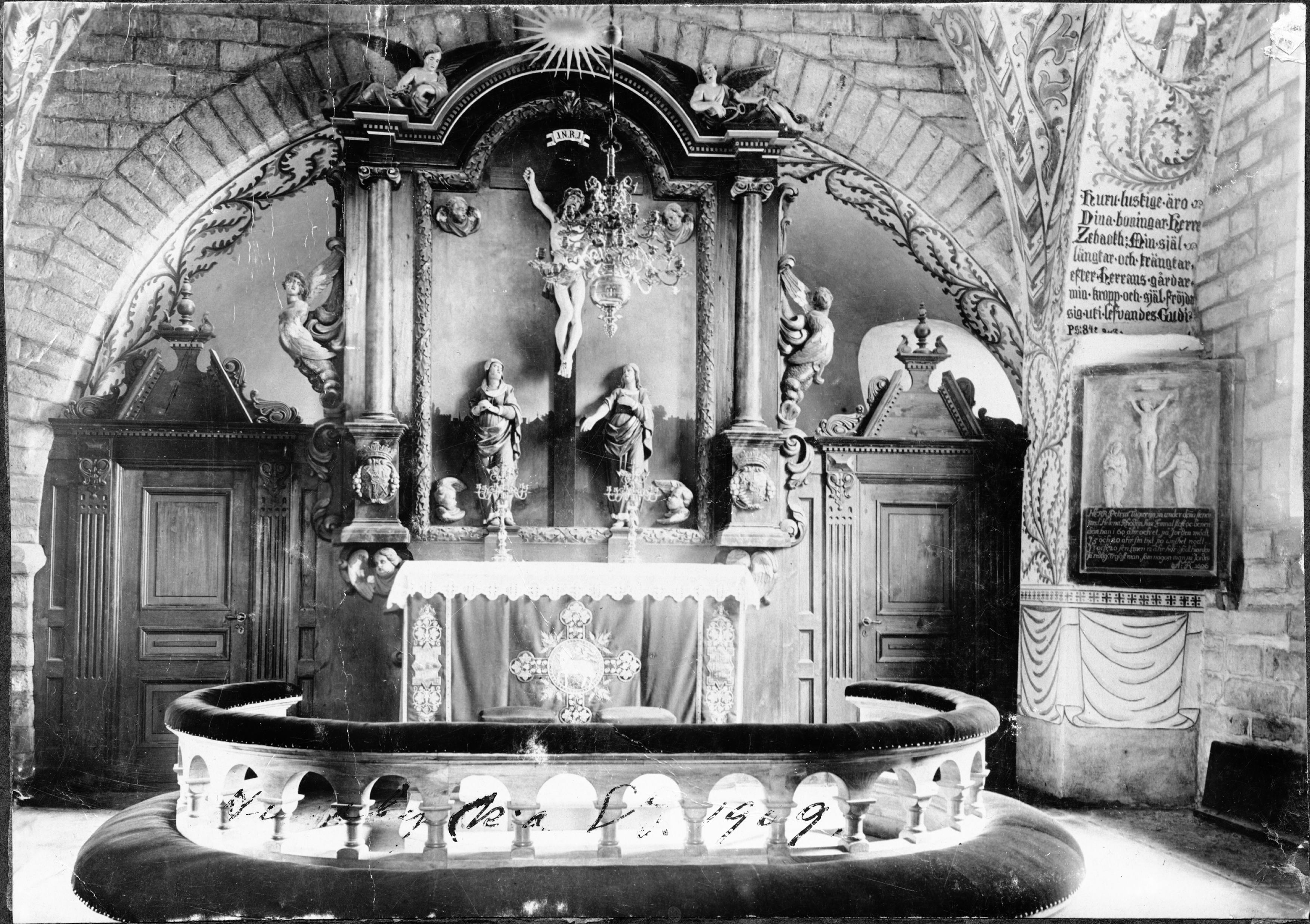 Beskrivning: Altare med altaruppsats från 1600-talet.