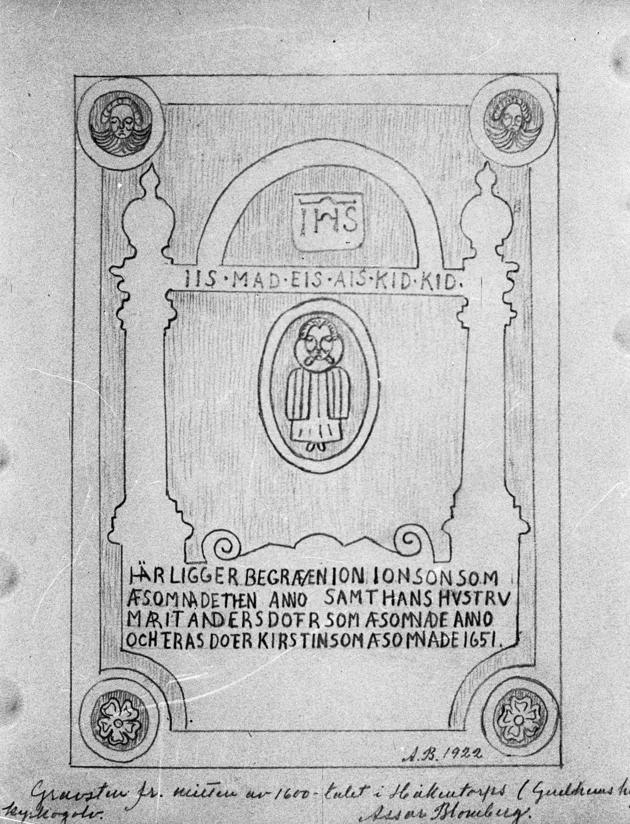 Beskrivning: Gravhäll, 1600-tal. Teckning av Assar Blomberg.