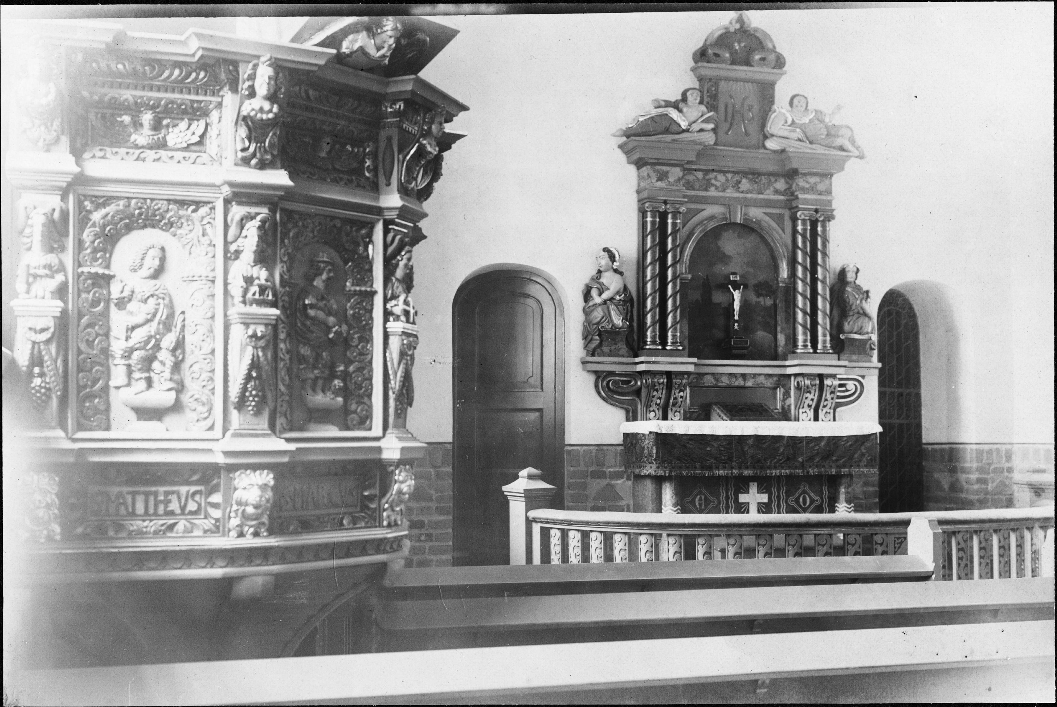 Beskrivning: Predikstol, mitten av 1600-talet, altare och altaruppsats i bakgrunden.