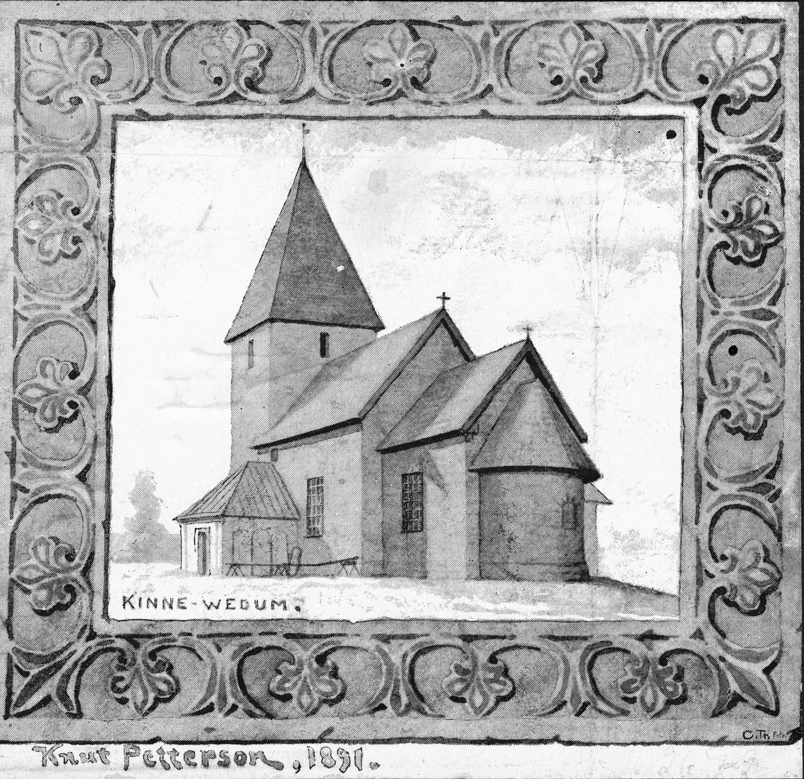 Beskrivning: Kyrkan från sydöst. Tryck av teckning av Knut Petterson, 1891.