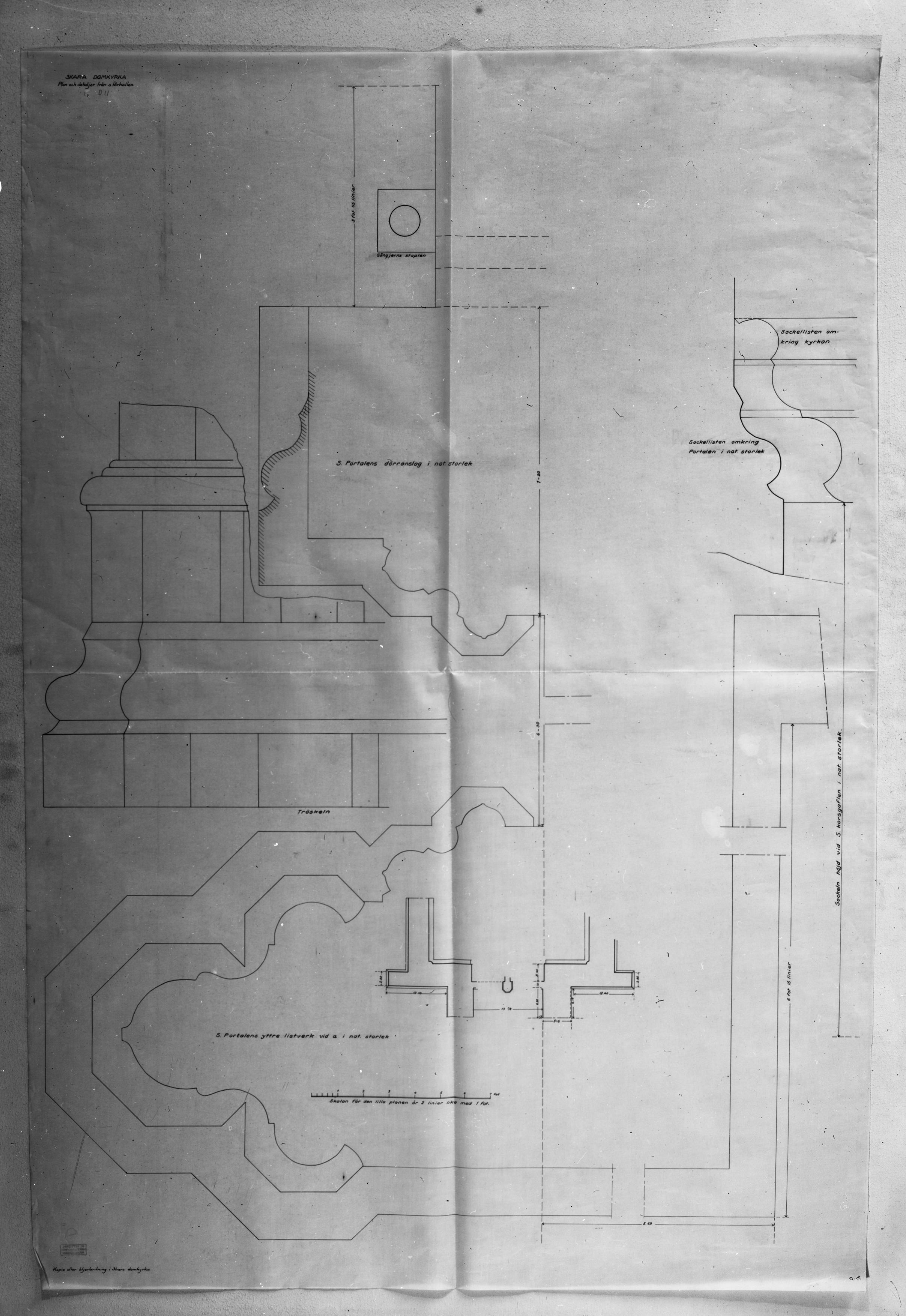 Beskrivning: Planlösning och detaljer från södra förhallen. Foto efter ritning.