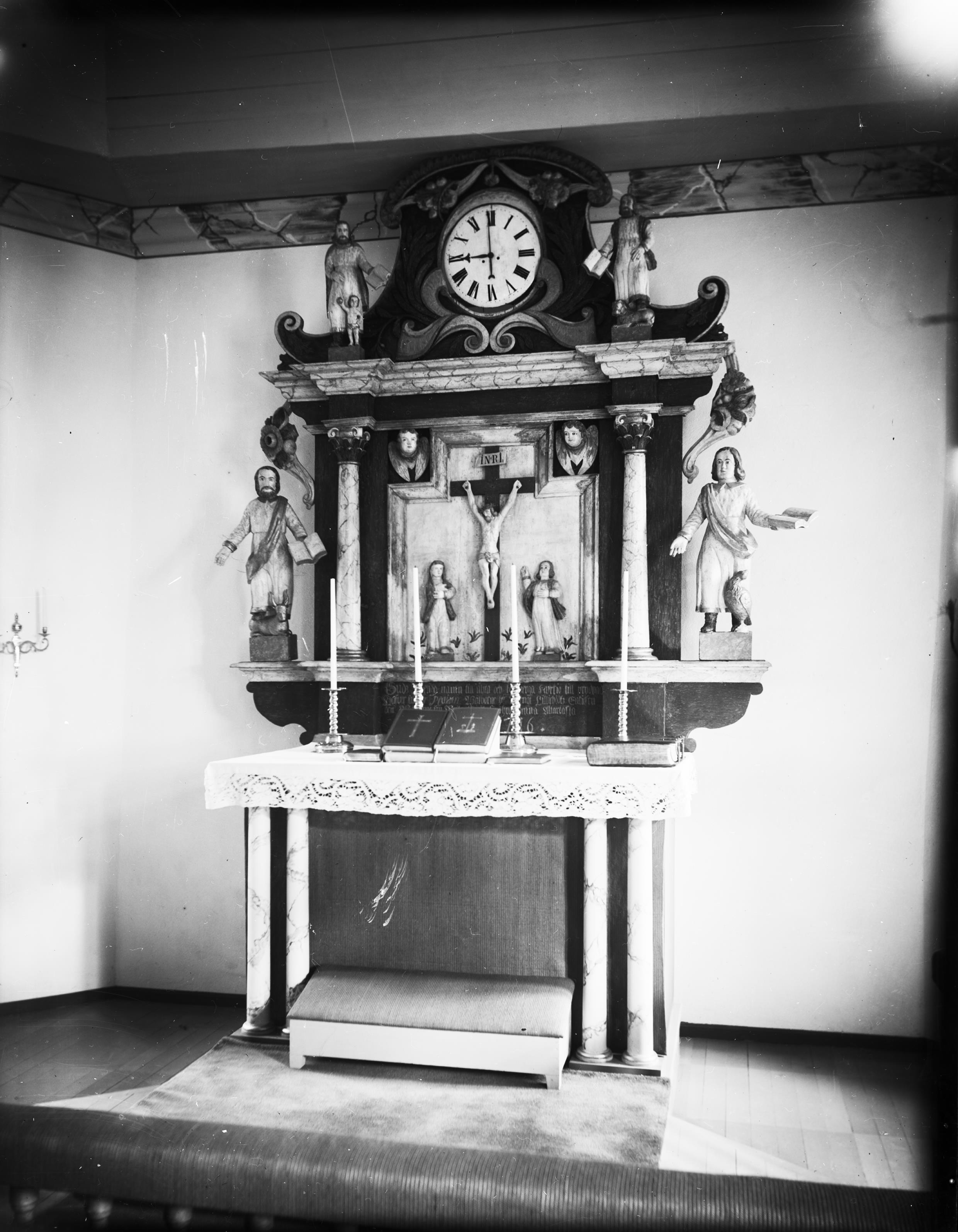 Beskrivning: Altare med altaruppsats, i mitten kalvariegrupp, 1600- eller 1700-talet. Efter restaurering.