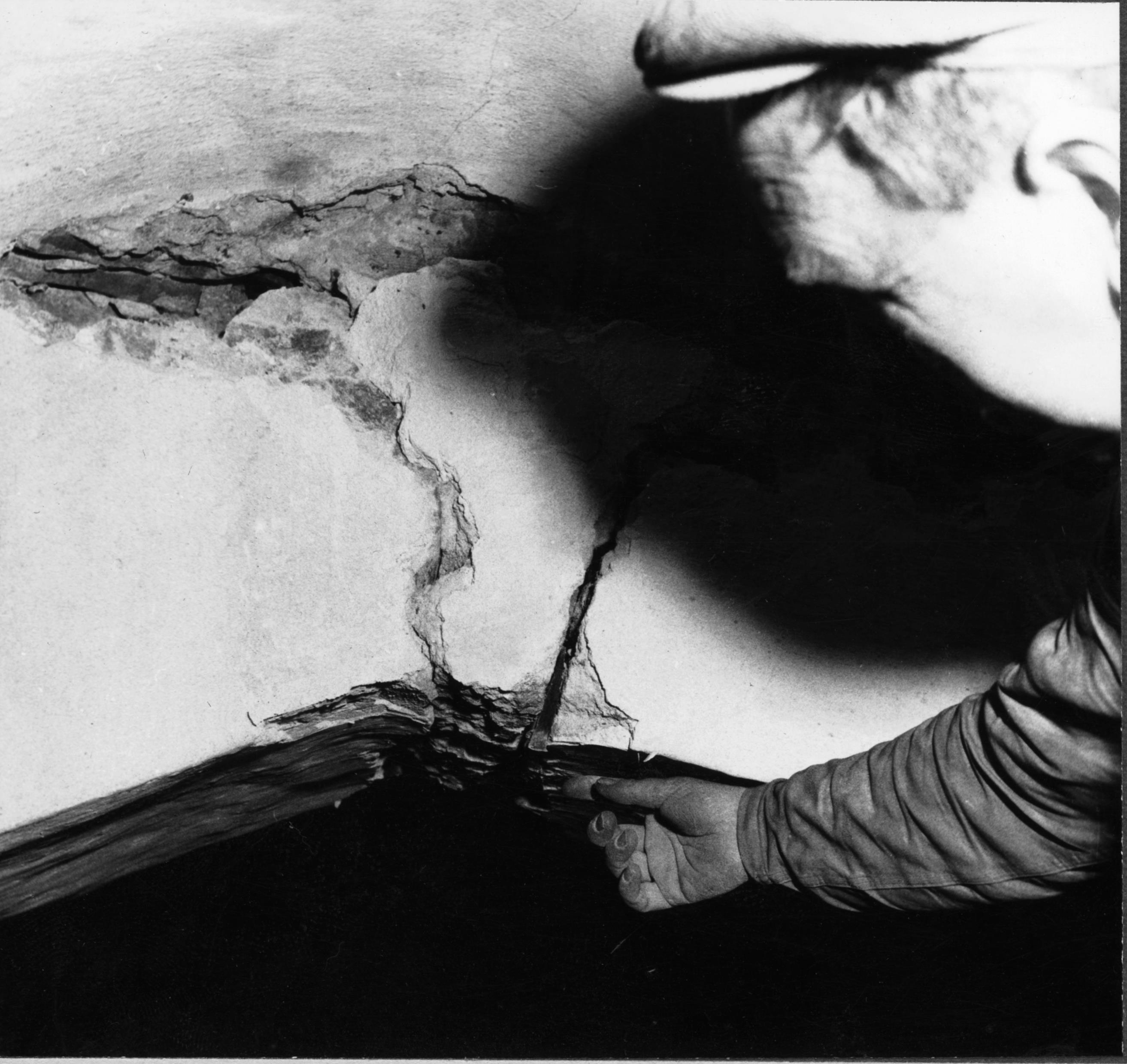 Beskrivning: Spricka i gördelbågen mellan långhusvalven. Före restaurering.