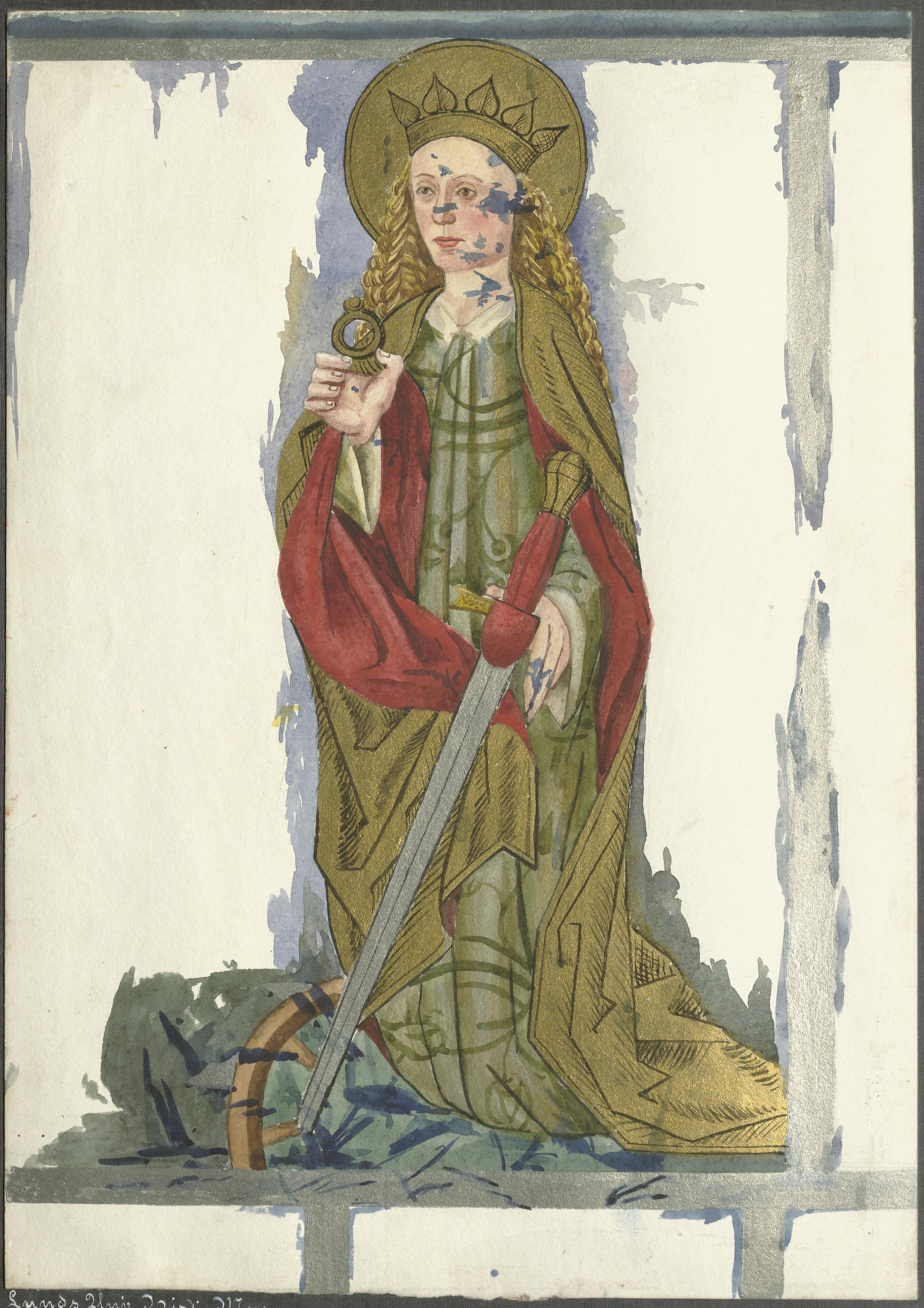 Beskrivning: S:ta Katarina av Alexandria. Den ena sidan av en processionsfana från senmedeltiden, nu i Domkyrkomuseet, inv.nr 3182:2. Akvarell.