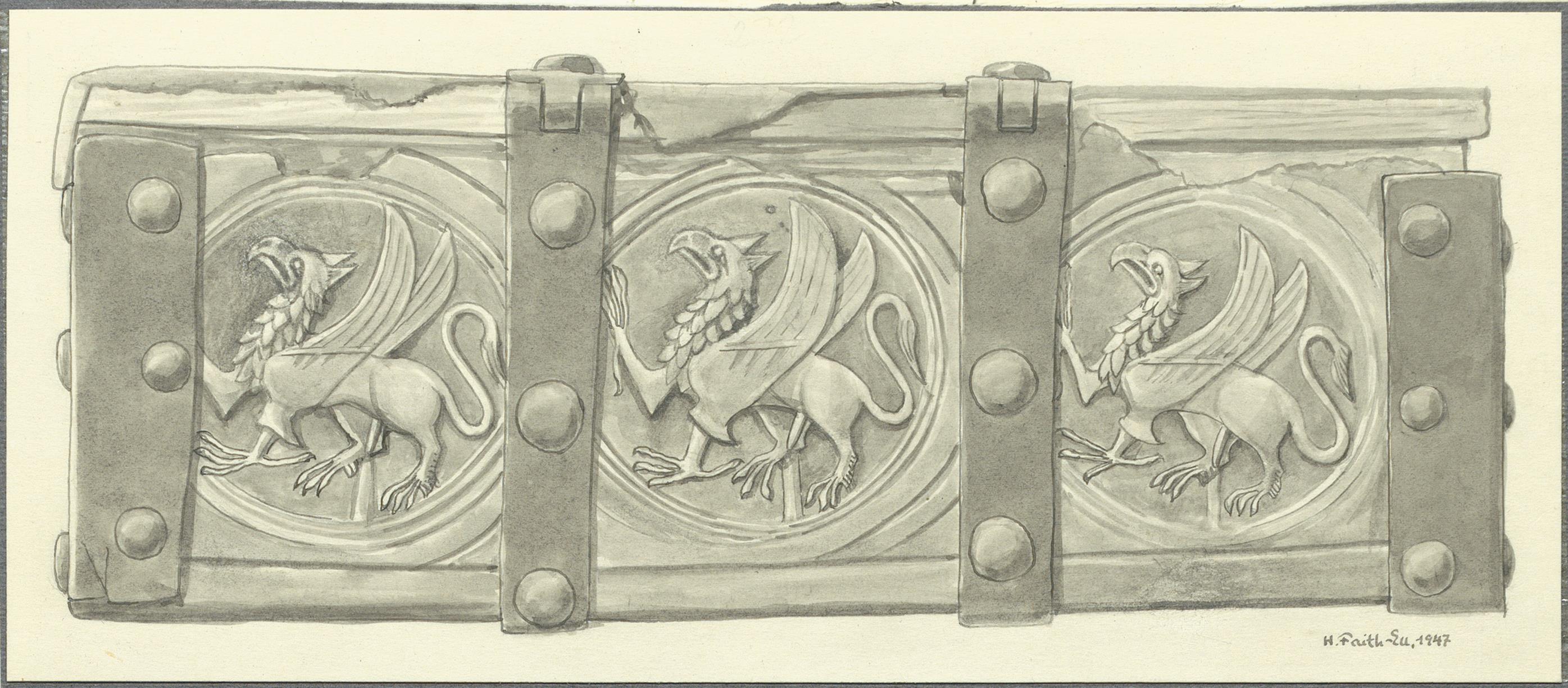 Beskrivning: Läderbeklätt skrin av ek. Motiv med gripar. Nu i Statens historiska museum inv.nr 24004. Lavering av Harald Faith-Ell 1947.
