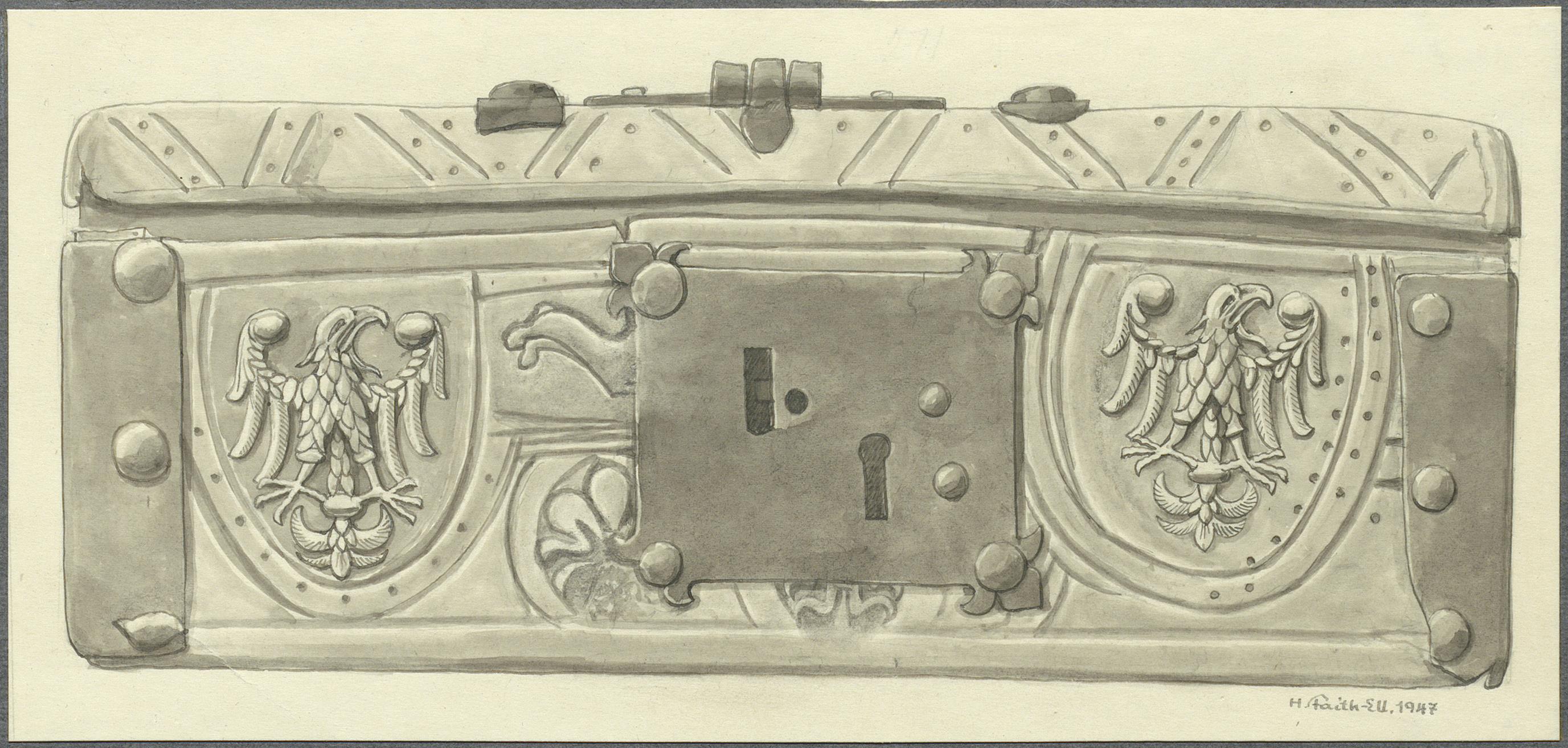Beskrivning: Läderbeklätt skrin av ek. Motiv med heraldiskt avbildade örnar. Nu i Statens historiska museum inv.nr 24004. Lavering av Harald Faith-Ell 1947.