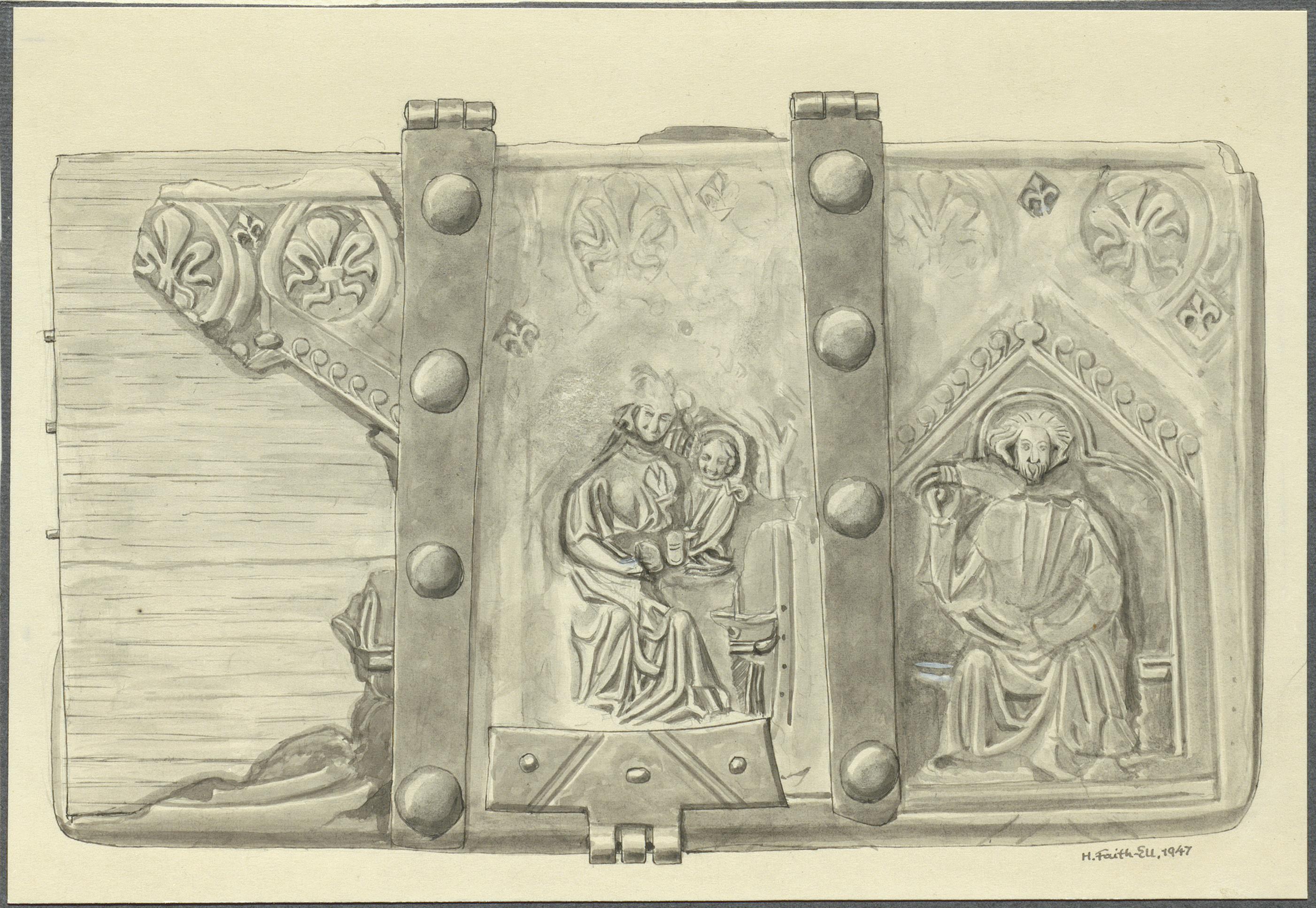Beskrivning: Läderbeklätt skrin av ek. Motiv med tronande Kristus och Madonnan med barnet. Nu i Statens historiska museum inv.nr 24004. Lavering av Harald Faith-Ell 1947.