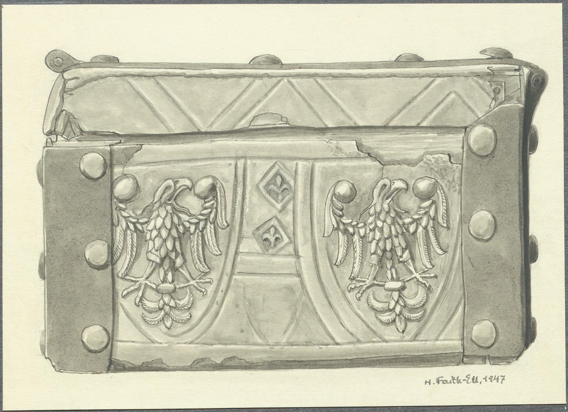 Beskrivning: Läderbeklätt skrin av ek. Motiv med heraldiskt avbildade örnar. Nu i Statens historiska museum inv.nr 24004. Lavering av Harald Faith-Ell 1947.