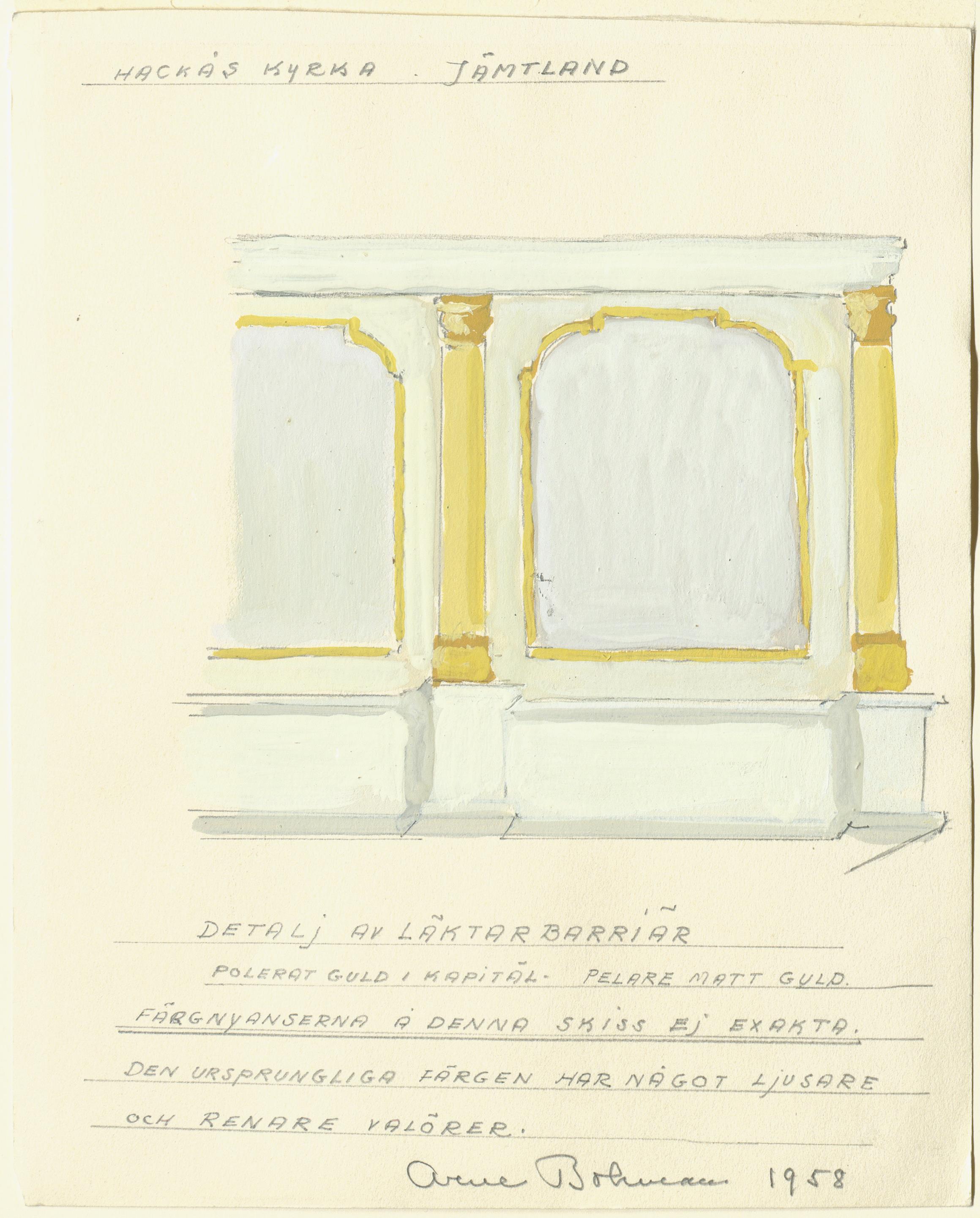 Beskrivning: Detalj av fält på orgelläktaren. Gouache av Arne Bohman 1958.