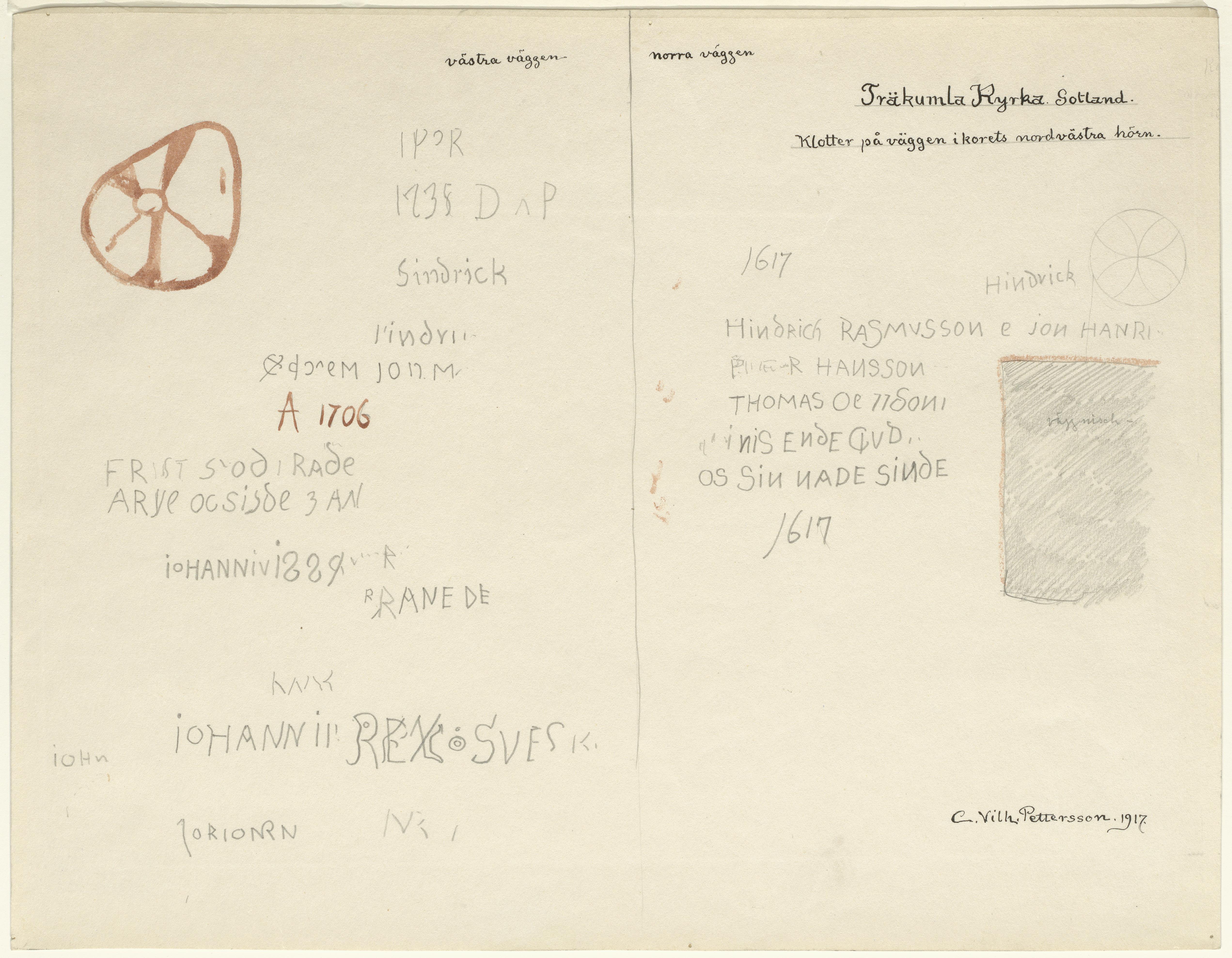 Beskrivning: Klotter på väggen i korets nordvästra hörn. Avbildat av Carl Wilhelm Pettersson 1917.