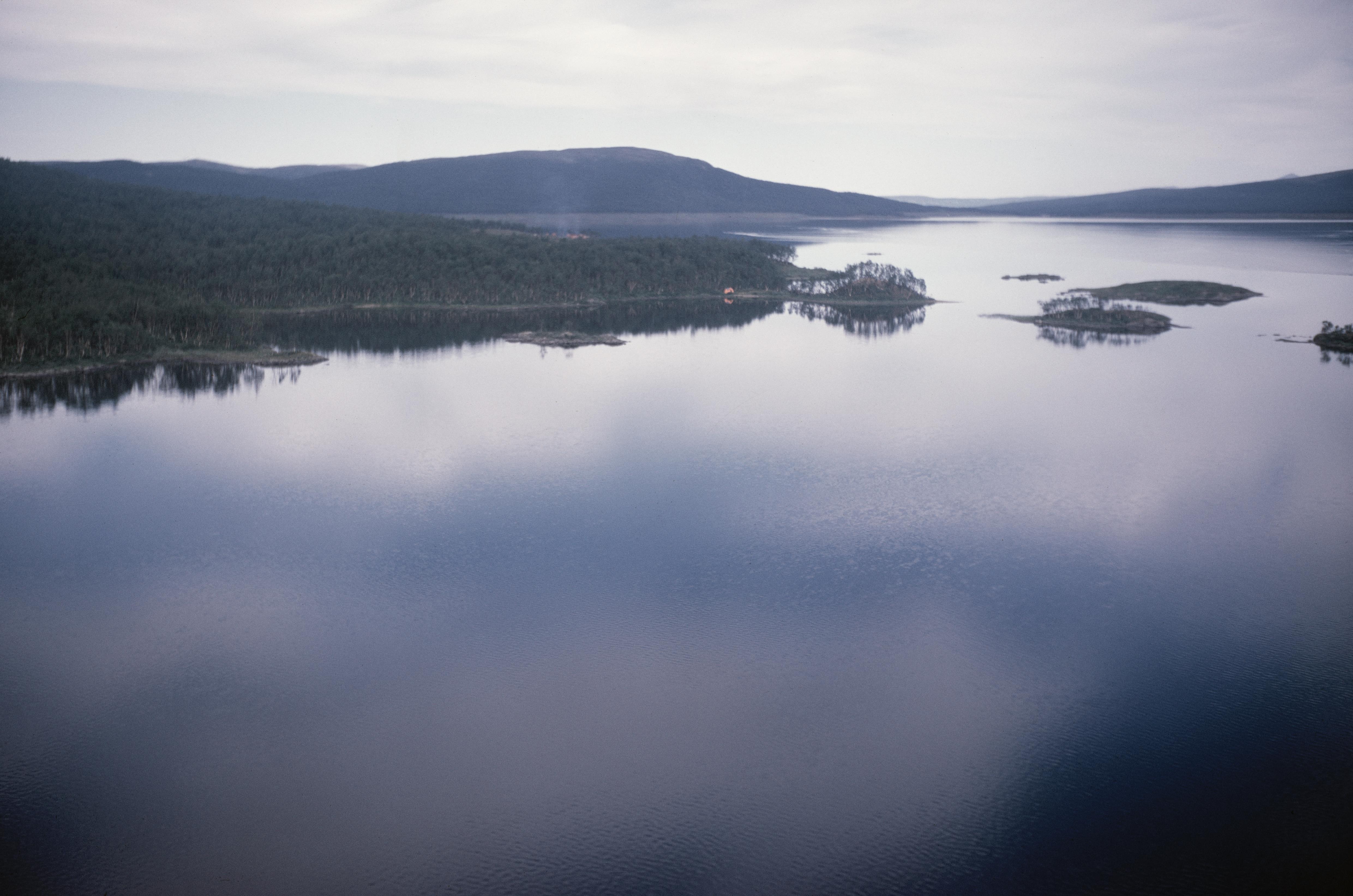 Beskrivning: Abelvattnets västra del (Jillie Aapije). innan sjöregleringen / uppdämningen. Dämningsröjning med vegetationsbränder har påbörjats. Uppe till vänster udden Tjuvvelge. Över bildens mitt Mittisundet (RAÄnr Tärna 125:1). I bildens övre del Abelvattnets östra del (Luvlie Aapije). Bilden är tagen mot (väderstreck): Ö