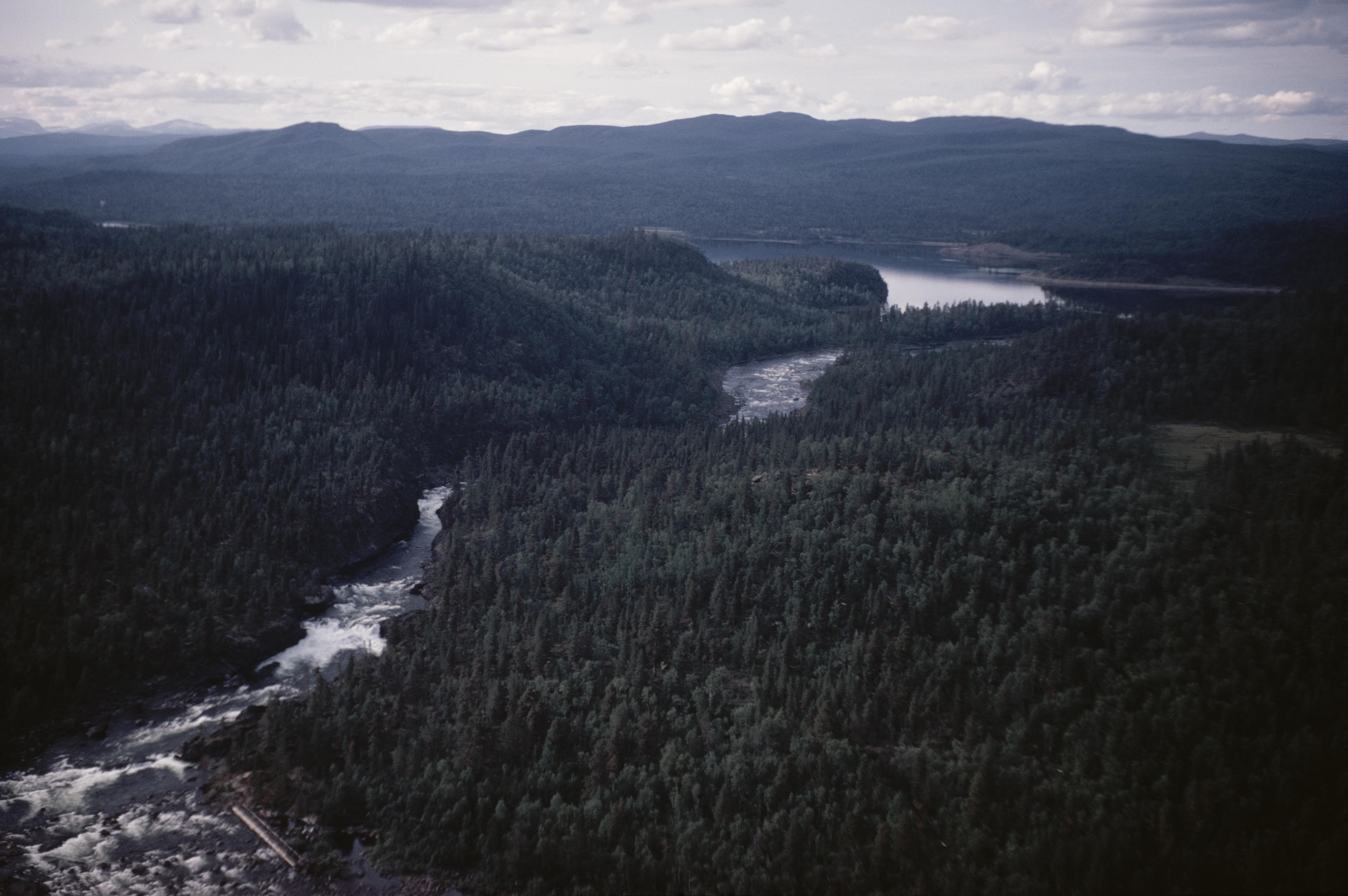 Beskrivning: Laisälvens (Lájsso) gamla utlopp (uppe till höger) och nya utloppet ur Gautosjön (Gávttojávrre / Gautojaure) i östra ändan av sjön. Märkberget till höger. Över bildens mitt boplats RAÄnr Arjeplog 558:1 vid Gautosjöns södra strand. I bildens övre del området Viejenäs. Bilden är tagen mot (väderstreck): NV