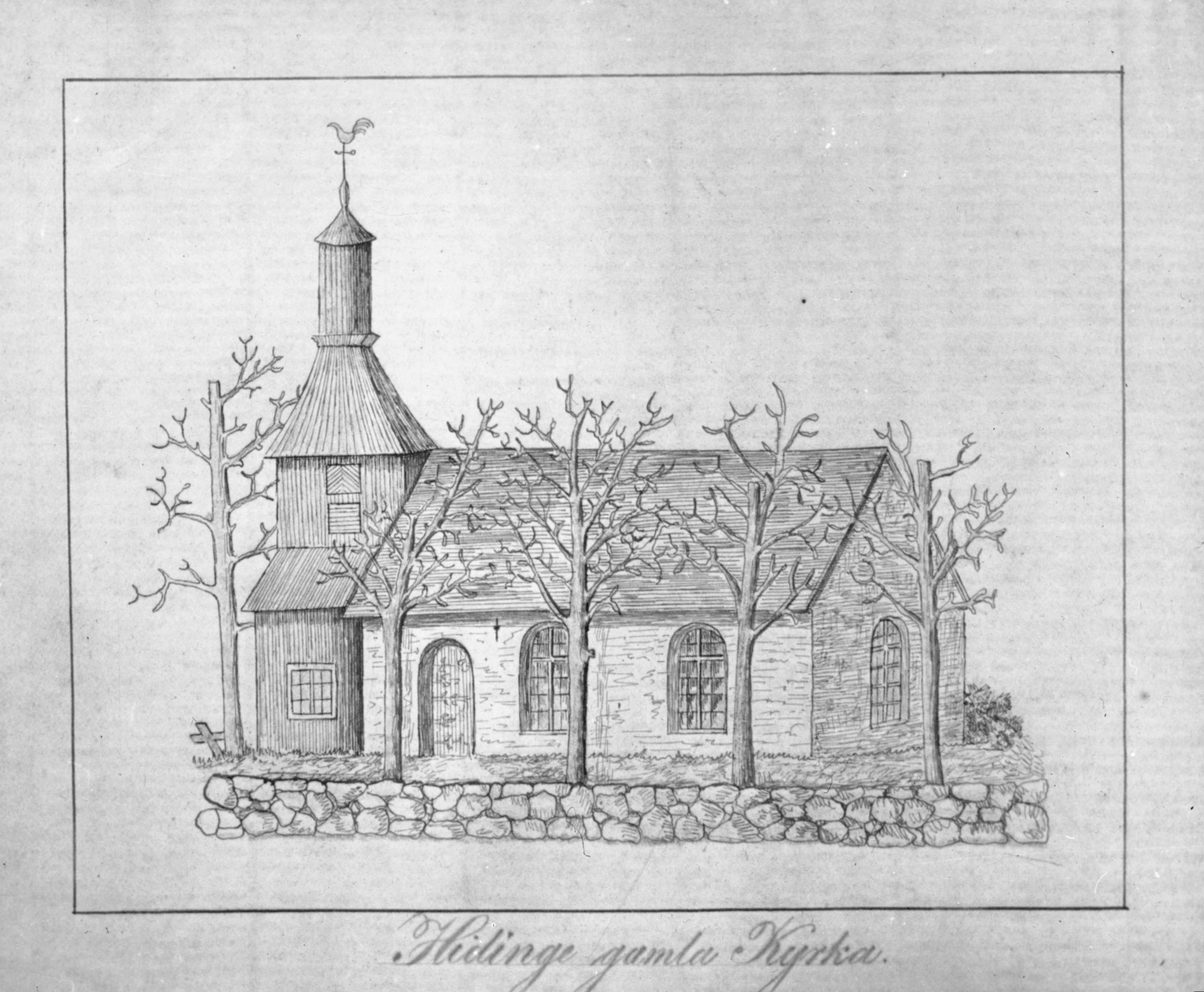 Beskrivning: Teckning av kyrkan. Foto efter teckning i Örebro länsmuseum.