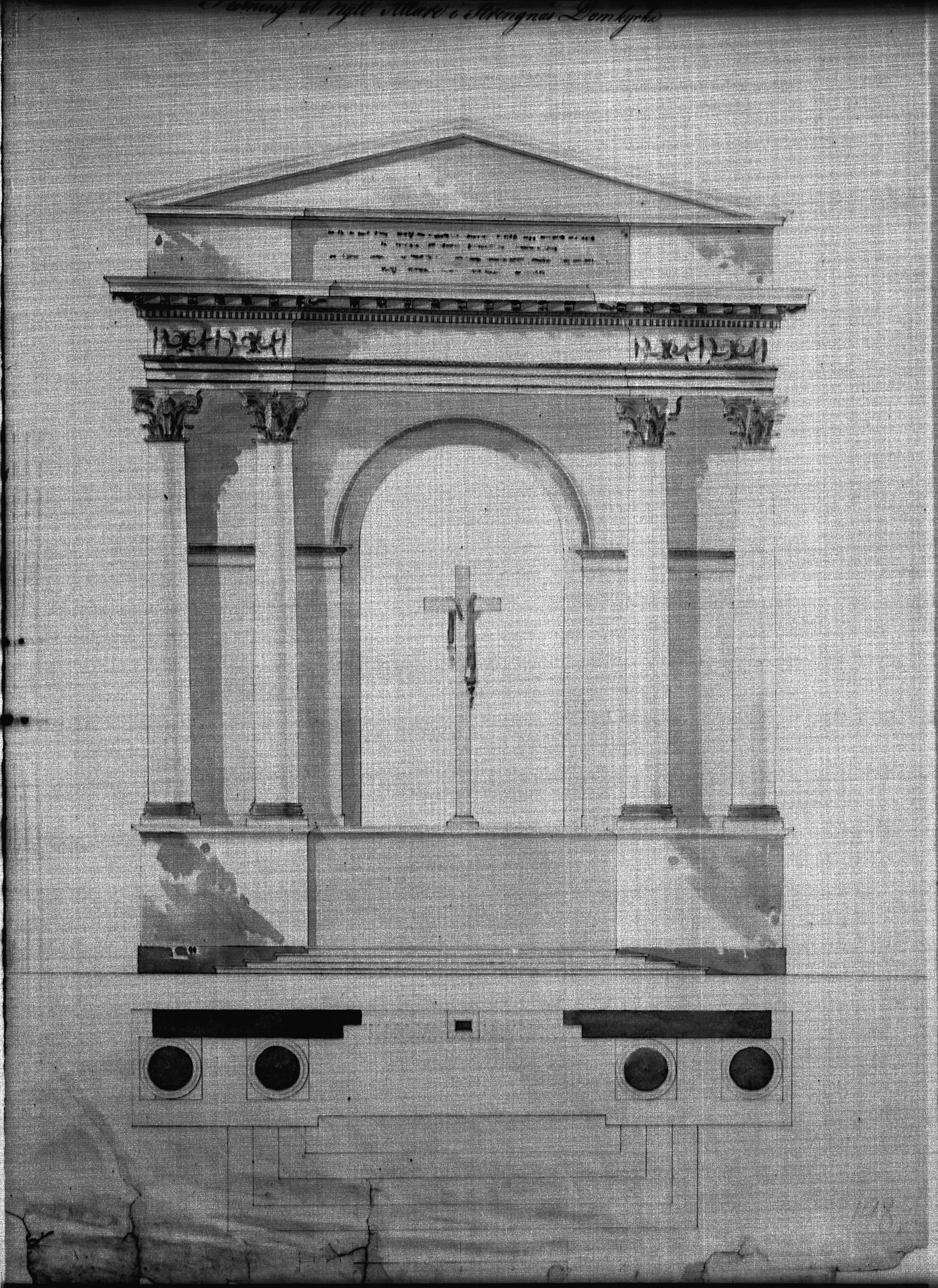 Beskrivning: Altare, Högaltaret, ritning, avfotograferad, efter ritning i Stockholms stadsarkiv.
