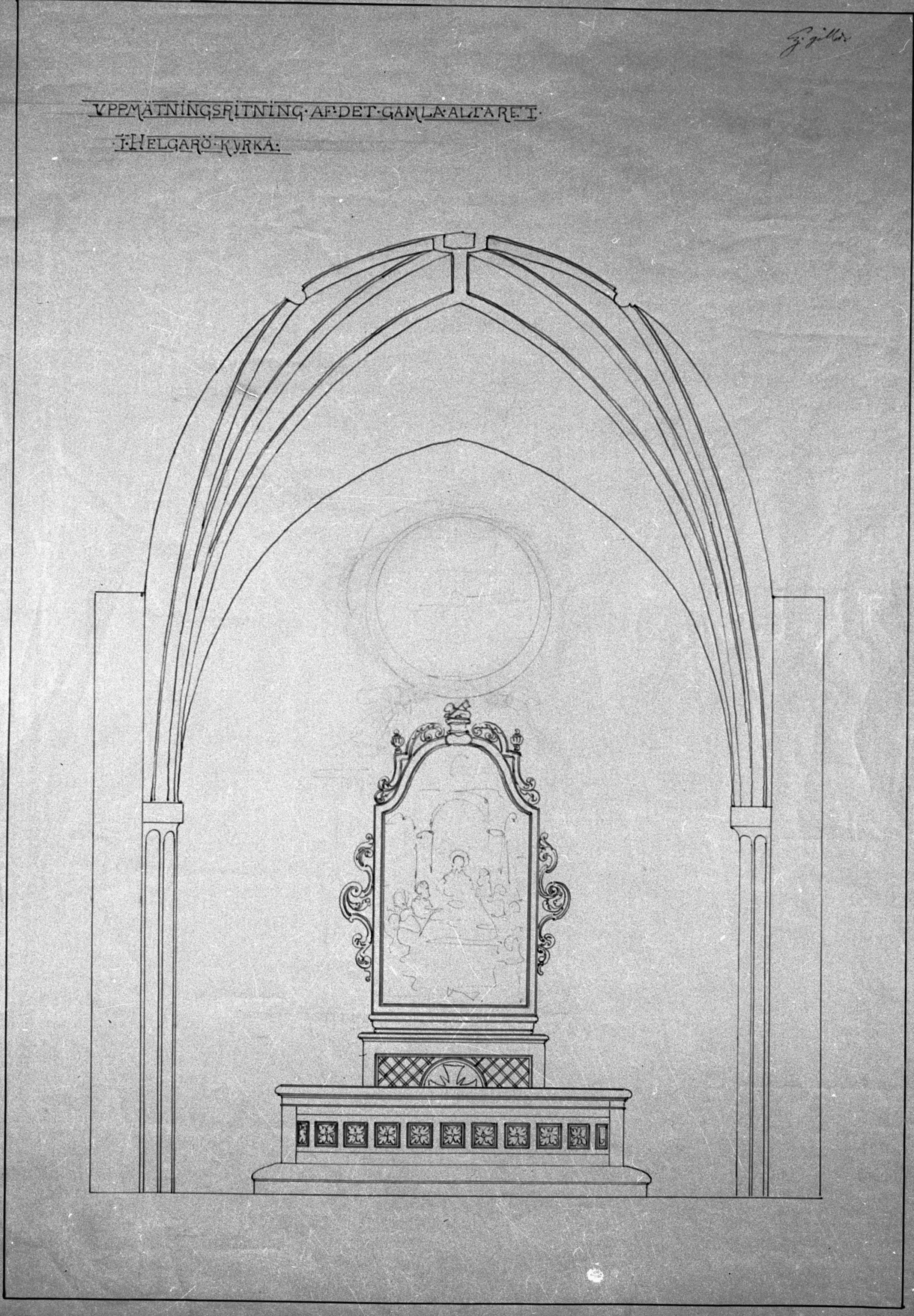 Beskrivning: Foto av ritning av gamla altaret. I kyrkans arkiv.