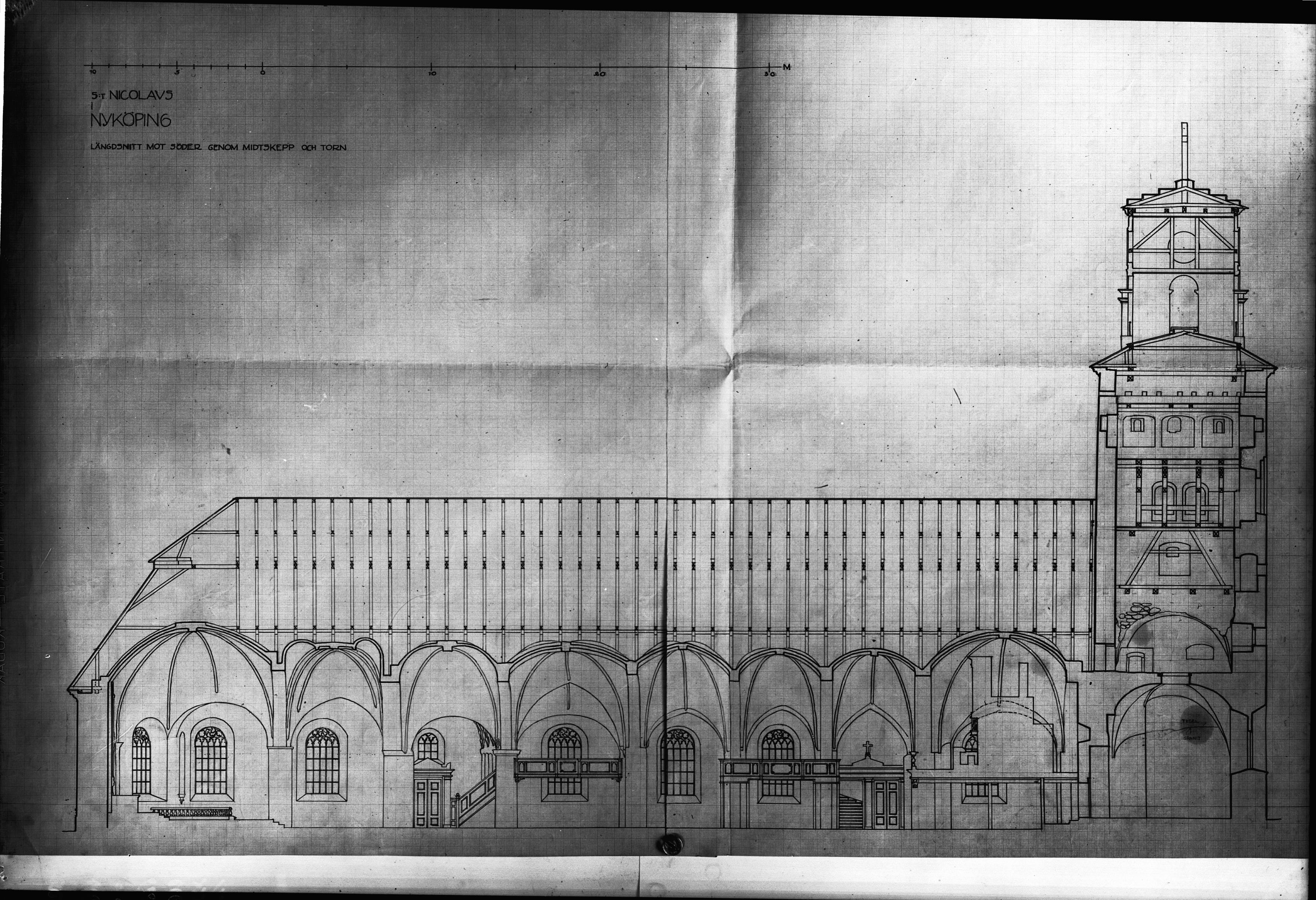 Beskrivning: Foto av ritning av genomskärning av kyrkan. Ur Sigurd Curmans samling.