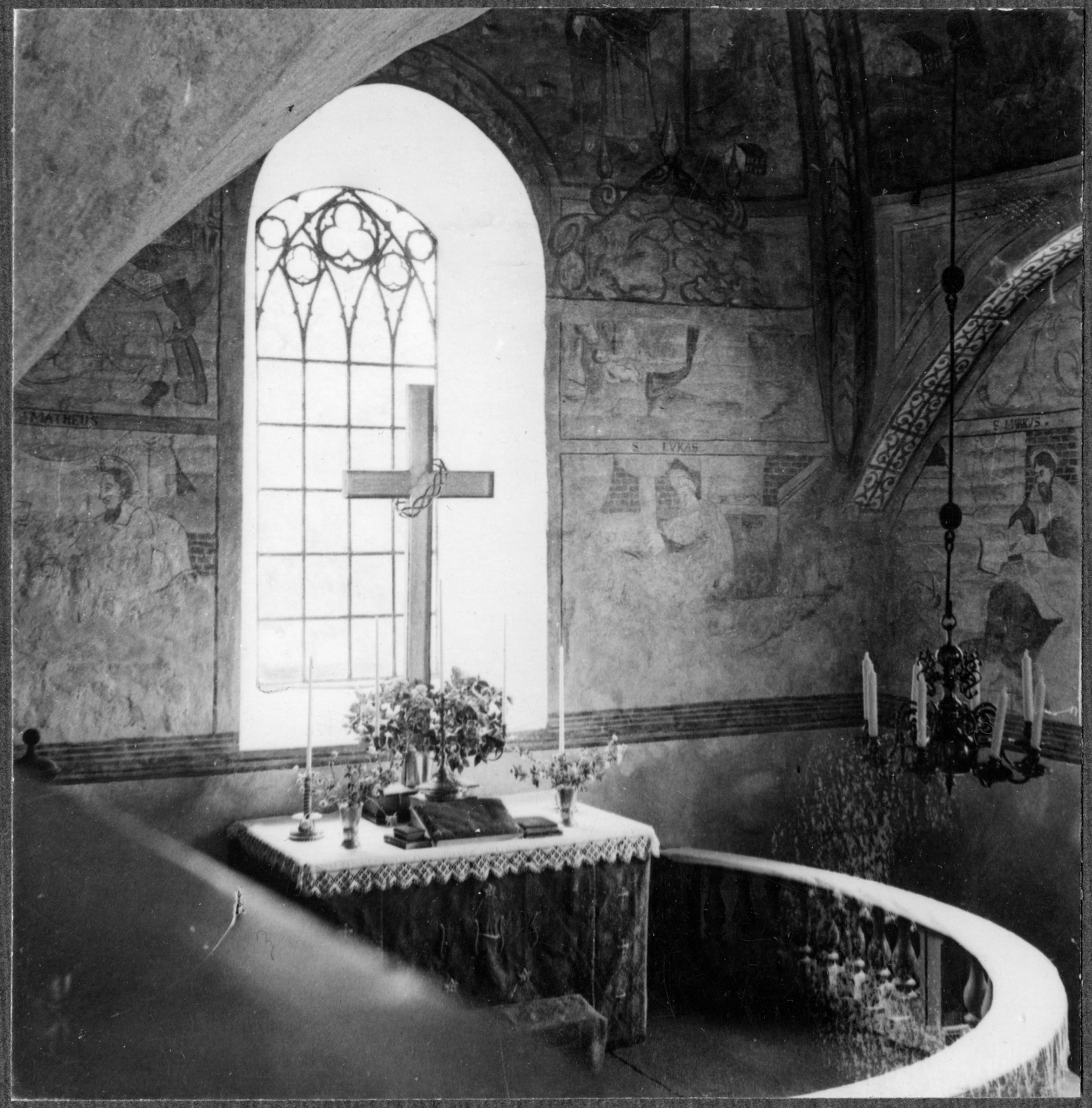 Beskrivning: Koret med altare och altarring. Efter restaurering.