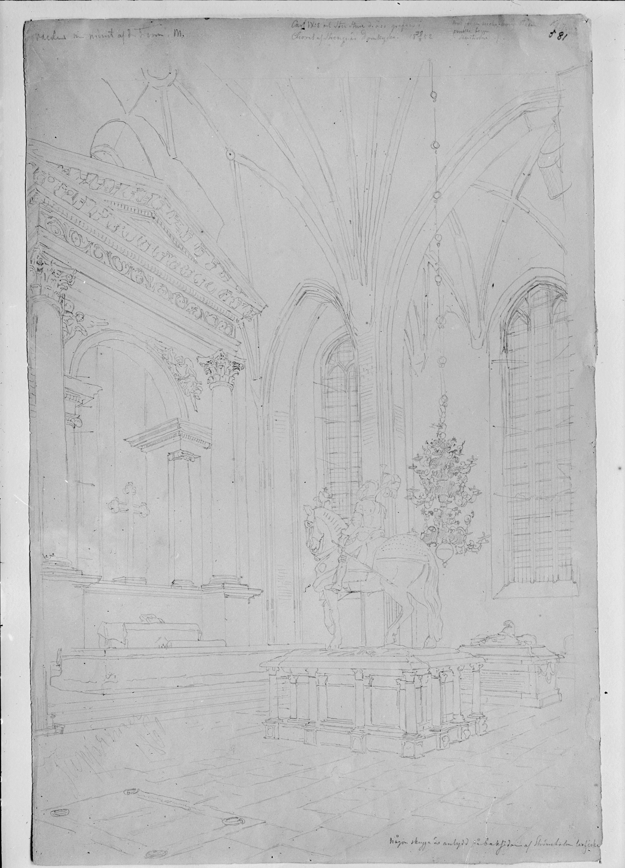 Beskrivning: Altare, Högaltaret, teckning av Billmark, avfotograferad, original Nationalmuseum.