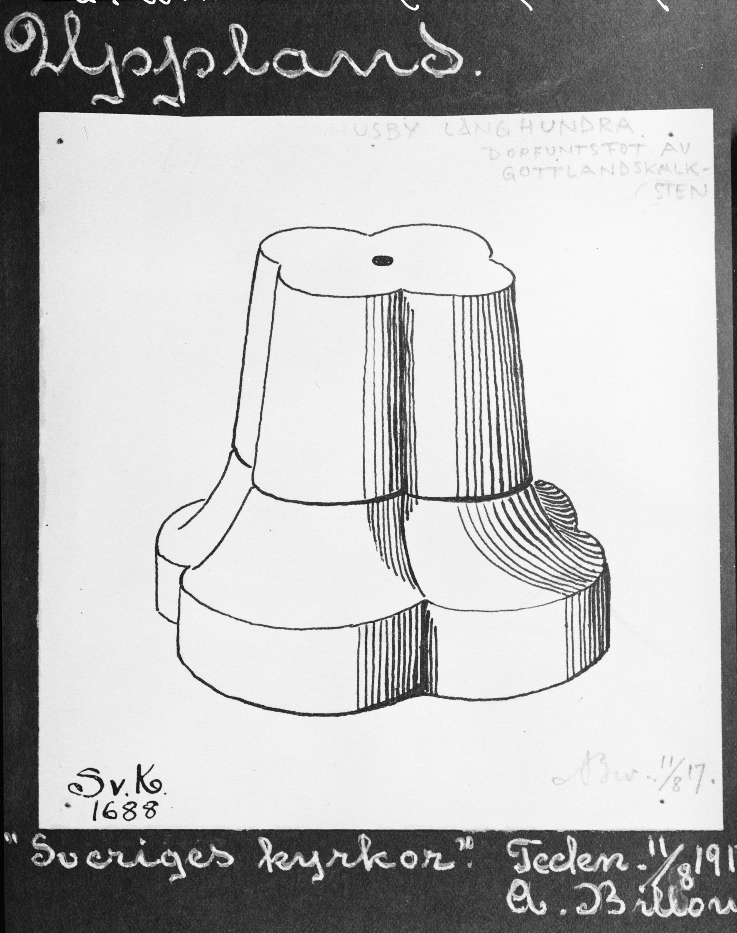 Beskrivning: Dopfunt av gotländsk kalksten. 1250-1300. Teckning av A. Billow 1917.