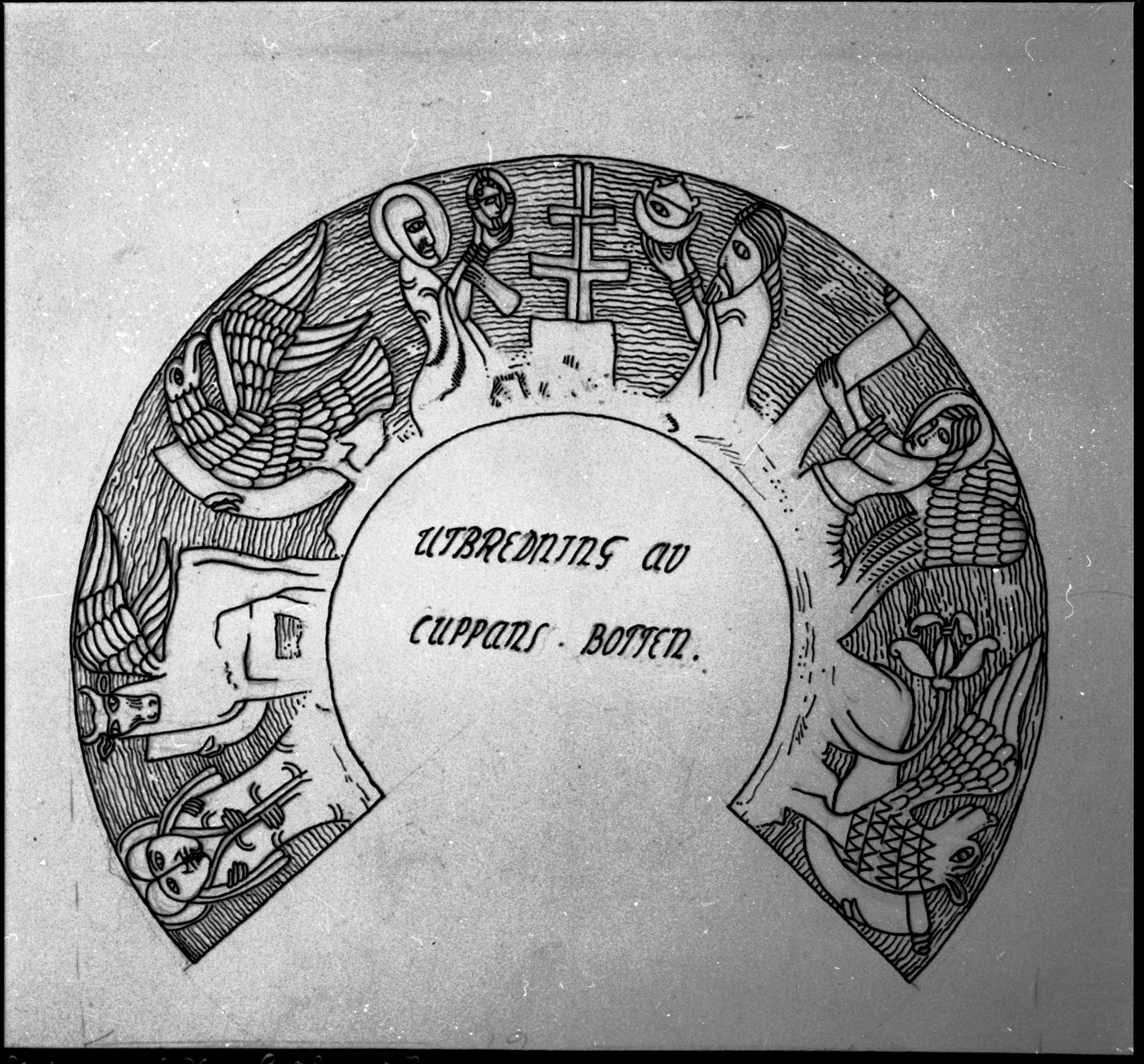 Beskrivning: Detalj av dopfunt av sandsten, cylindrisk, av Magister Majestatis, 1100-talet. Foto efter teckning. Uppmätt av Sten Anjou. Original i handteckningssamlingen, ATA.