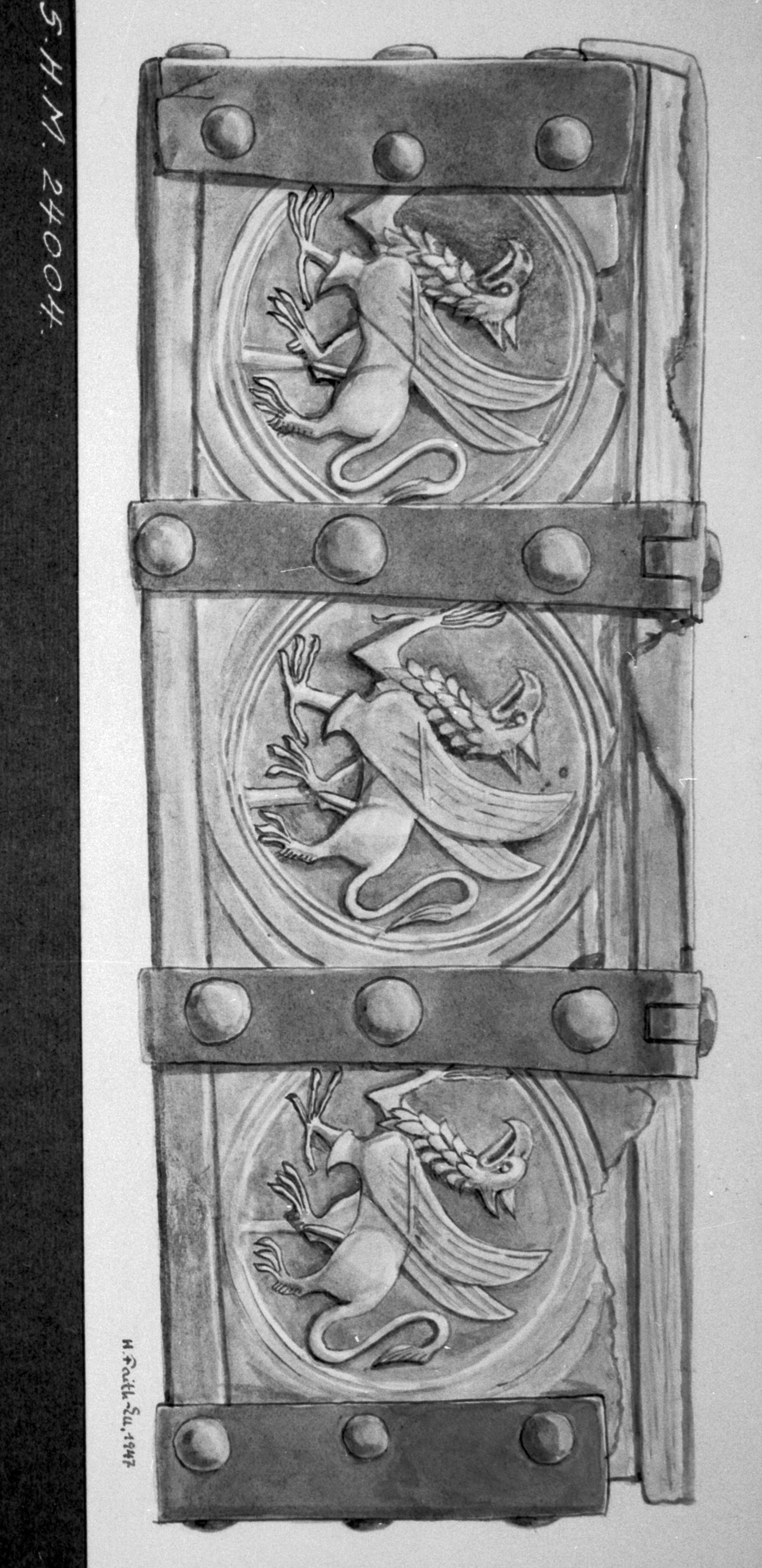 Beskrivning: Foto av teckning av Harald Faith-Ell 1947, läderbeklätt skrin av ek med järnbeslag. Original i Handteckningssamlingen, ATA.
