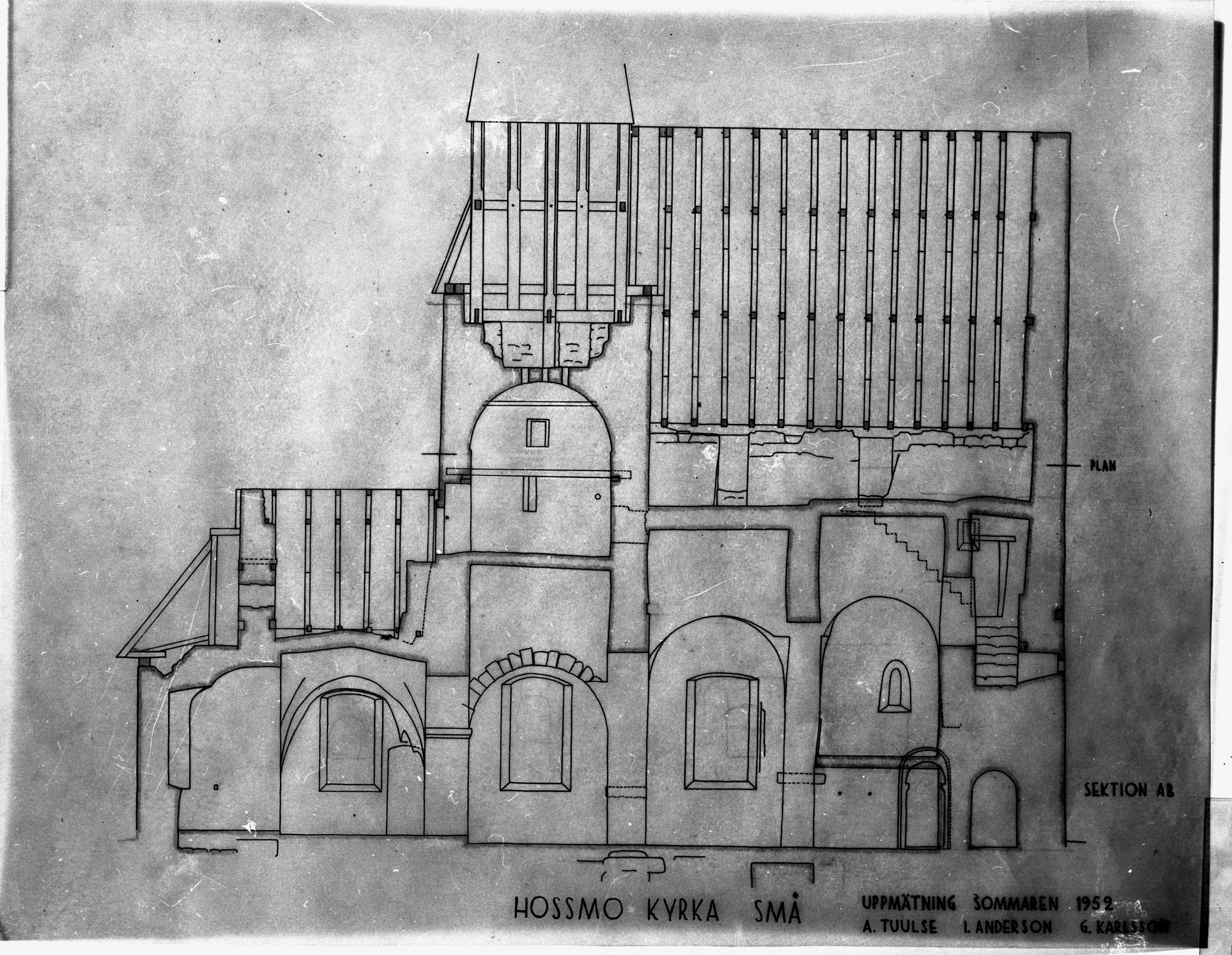 Beskrivning: Långhus, kor och absid i genomskärning, enligt uppmätning 1952. (förstoring)