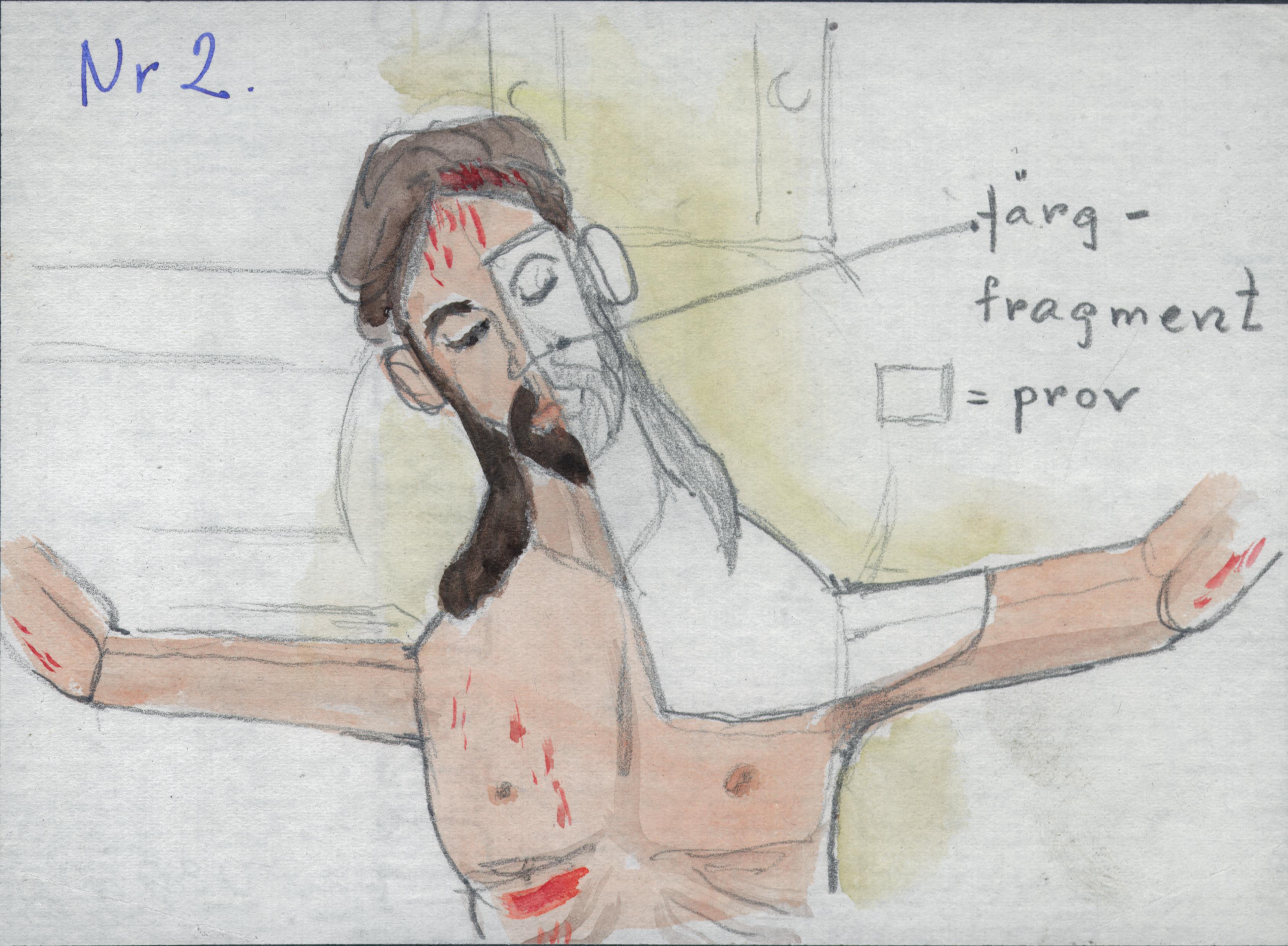 Beskrivning: Triumfkrucifix av trä. Skiss nr. 2. Skissen troligen utförd av Marguerite Husberg.