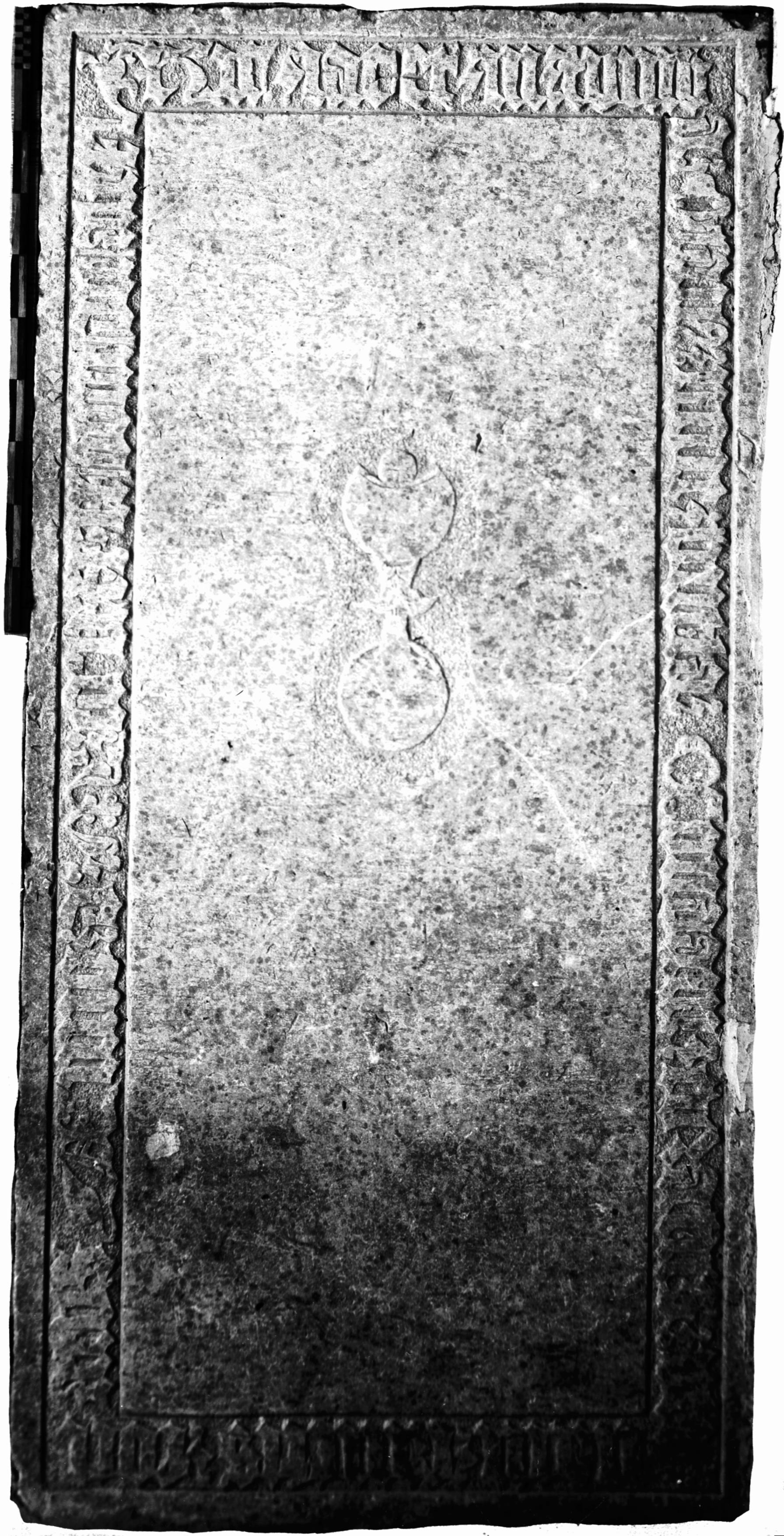 Beskrivning: Gravhäll, i golvet framför altaret.