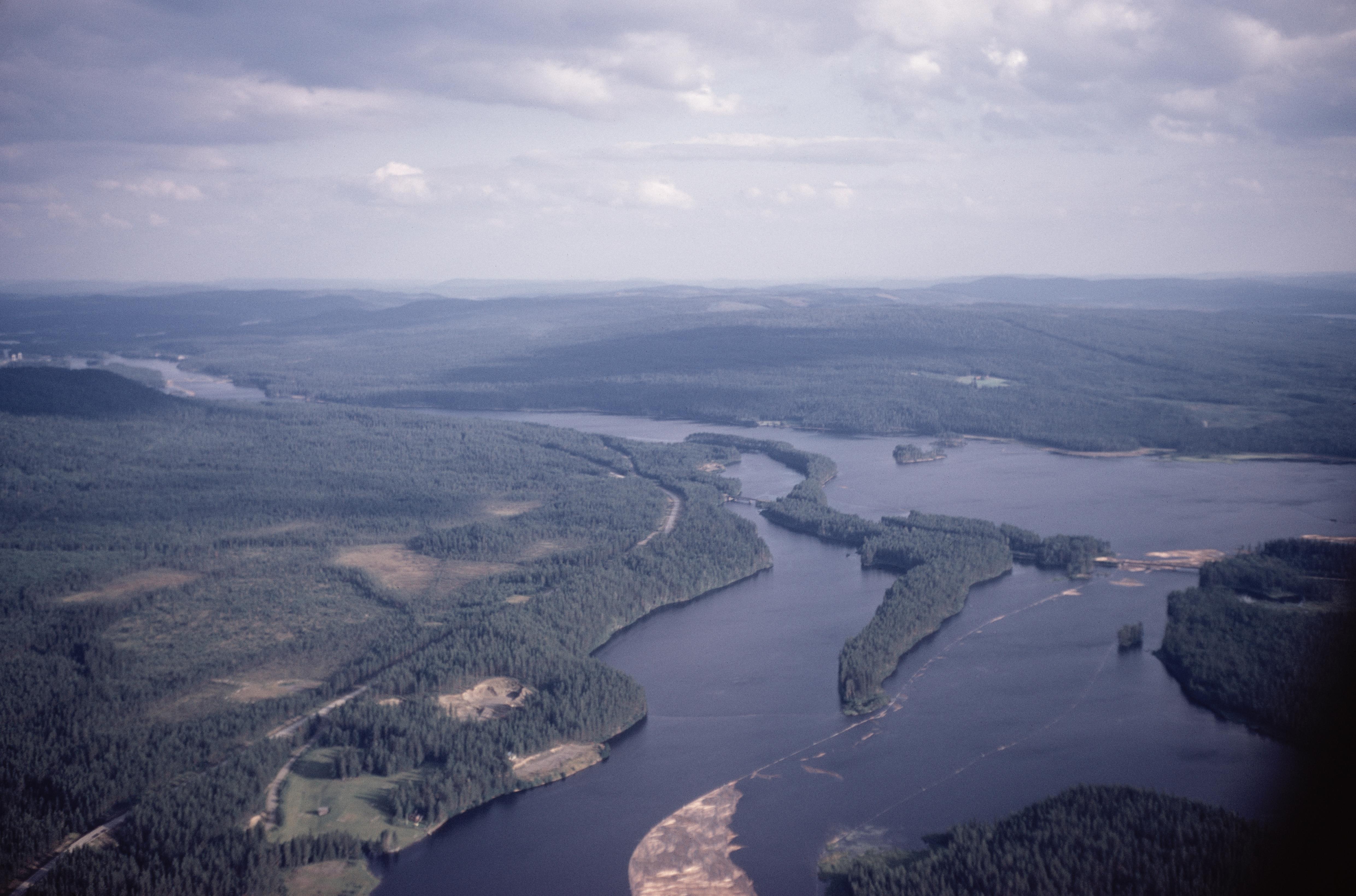 Beskrivning: Tåsjöån möter Grundfjärden i nordvästra delen av Hotingssjön (skrivs även Hotingsjön). Nere till vänster Väster-Hotingsbodarna. Till höger vid bildens mitt Långön med fångstgrop RAÄnr Tåsjö 182:1, boplats Tåsjö 250:1, gravfält Tåsjö 155:1 m.fl. Bilden är tagen mot (väderstreck): SSO