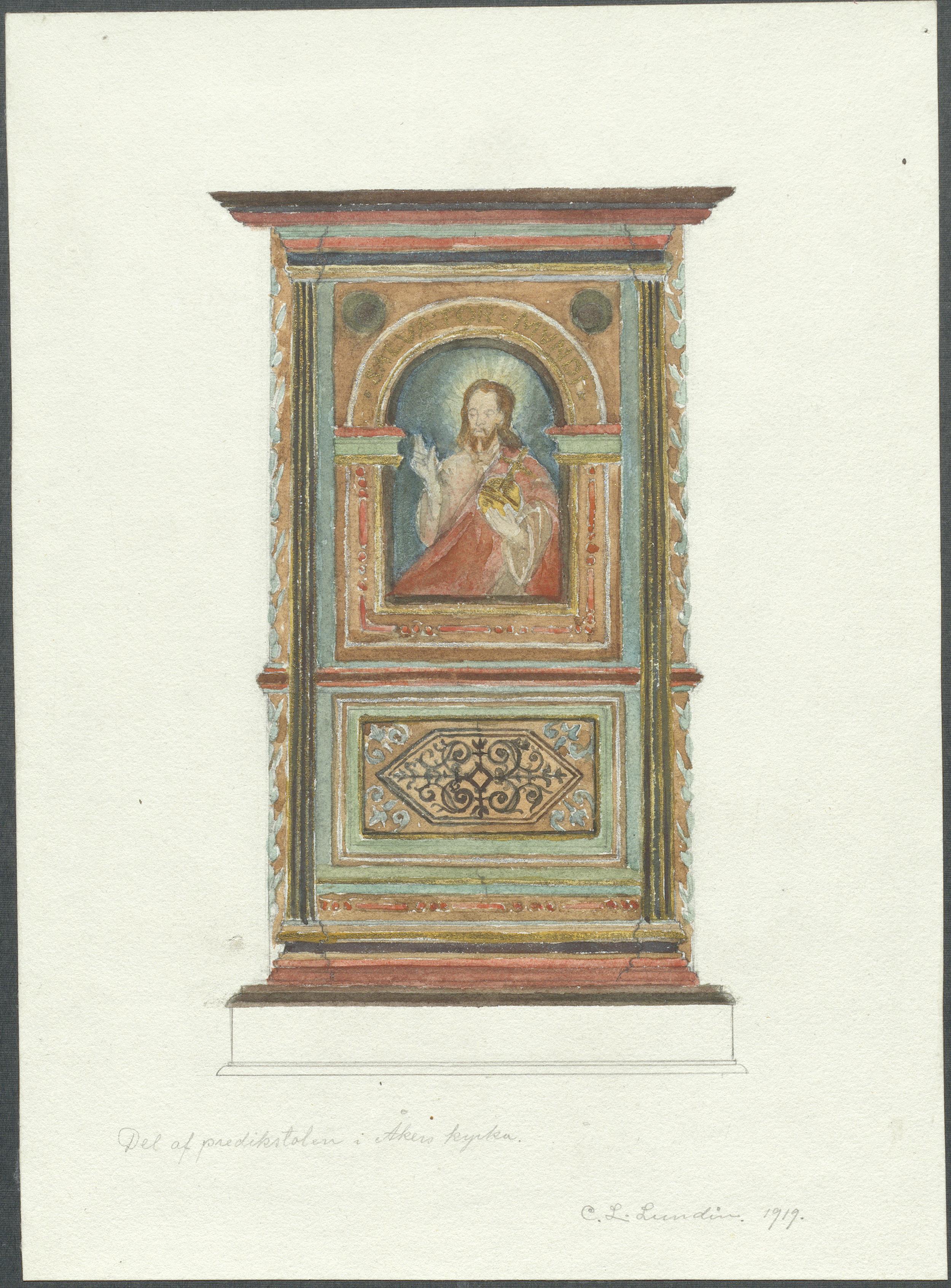 Beskrivning: Detalj av predikstolen från 1629 som visar Kristus i ett bildfält. Akvarell av Carl Leopold Lundin 1919.