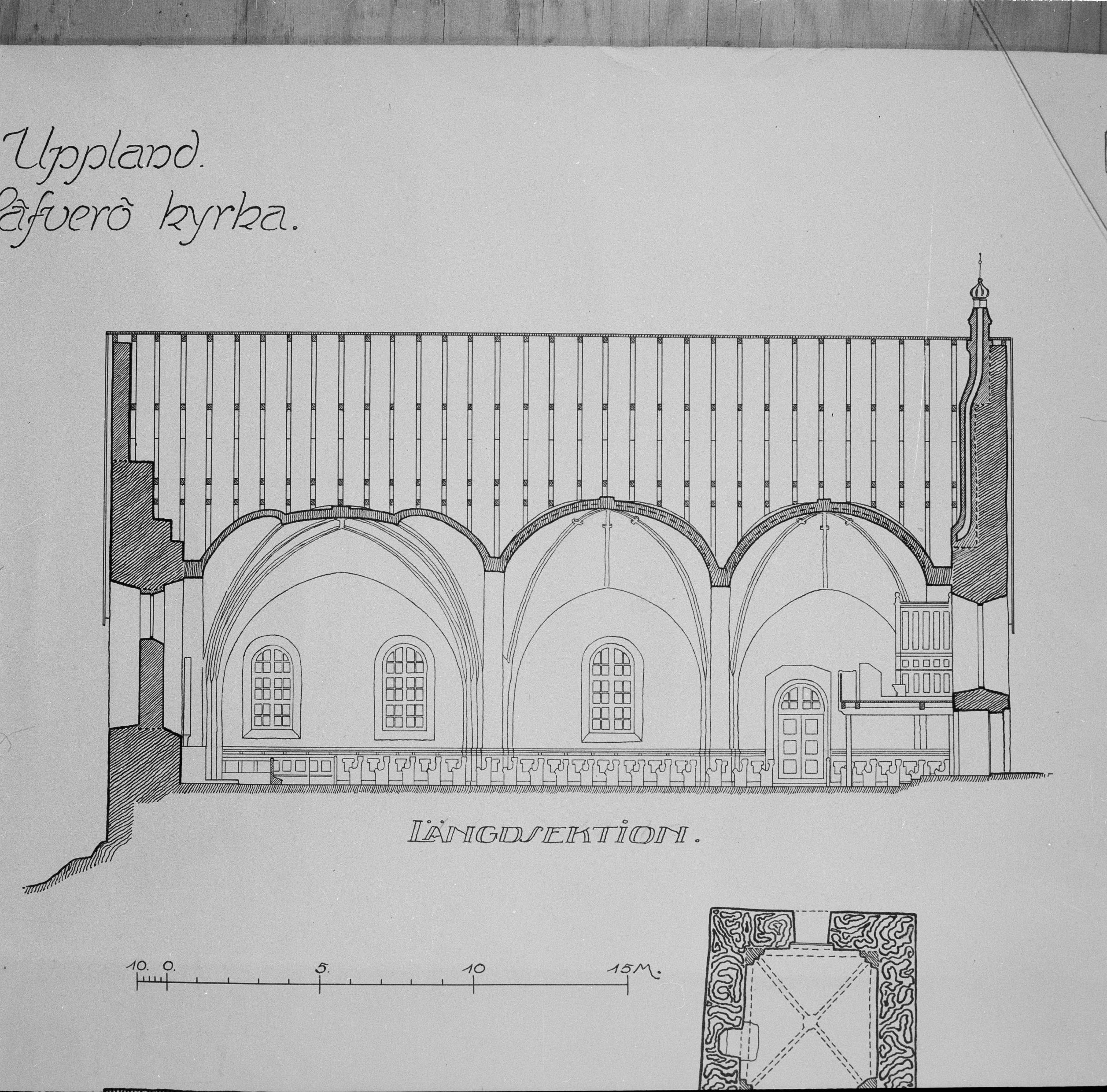 Beskrivning: Kyrkan mot söder, avfotograferad längdsektion.