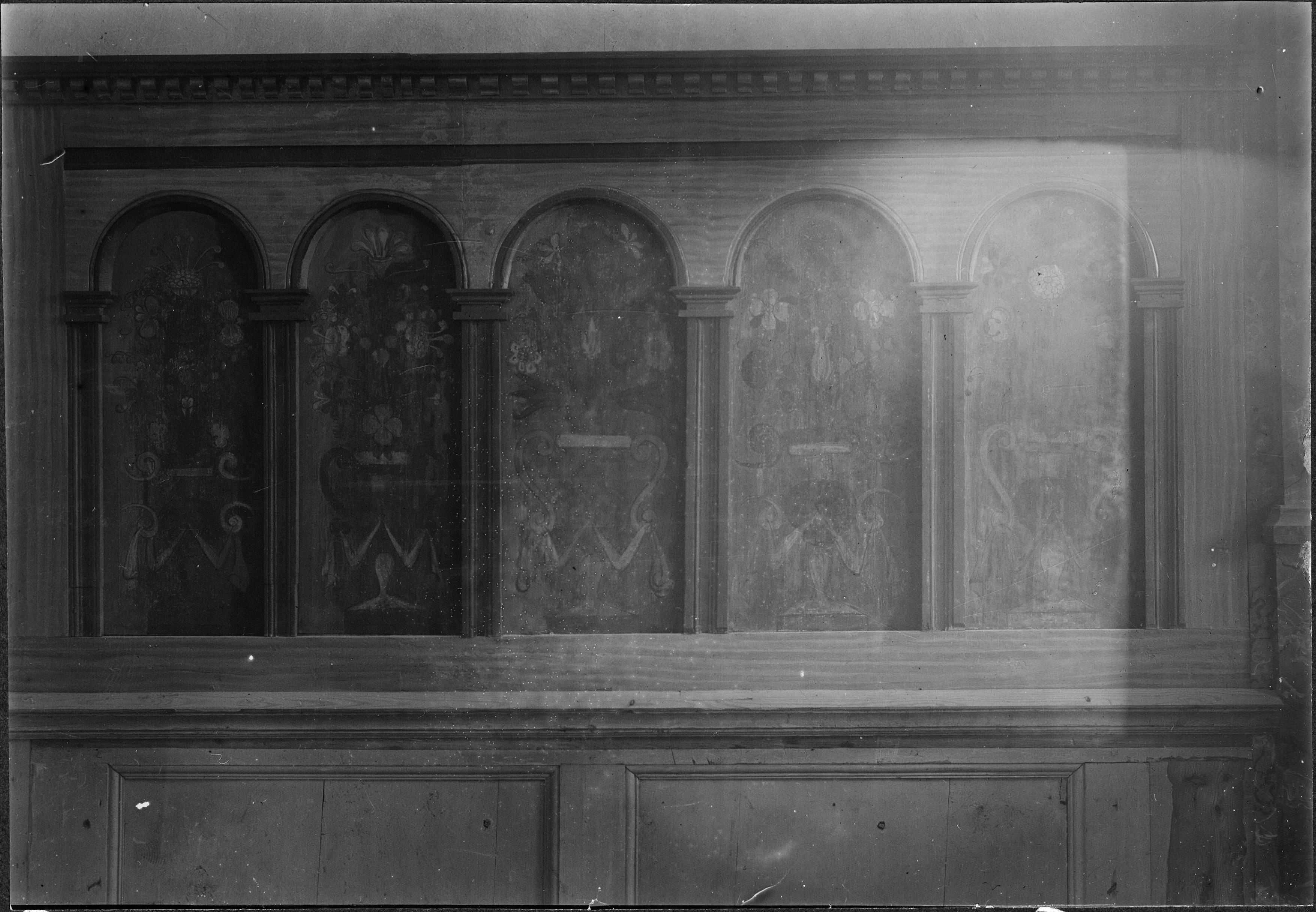 Beskrivning: Panel på östra väggen norr om altaret. Har tillhört korbänk.