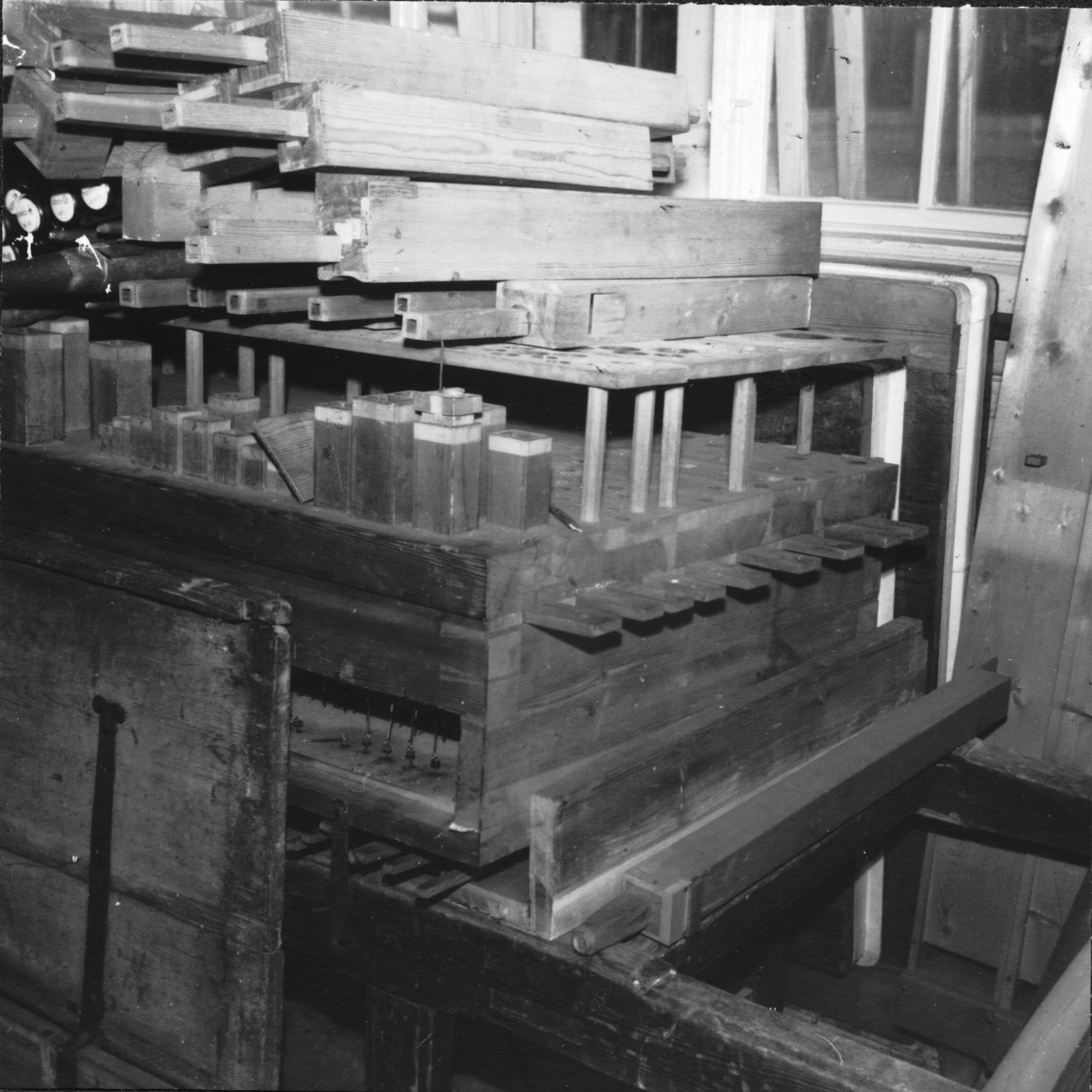 Beskrivning: Bjursås gamla kyrkorgel , byggd av delar ur Kristine kyrkas orgel, Falun. (Johan Nicklas Cahman 1723). Väderlåda.
