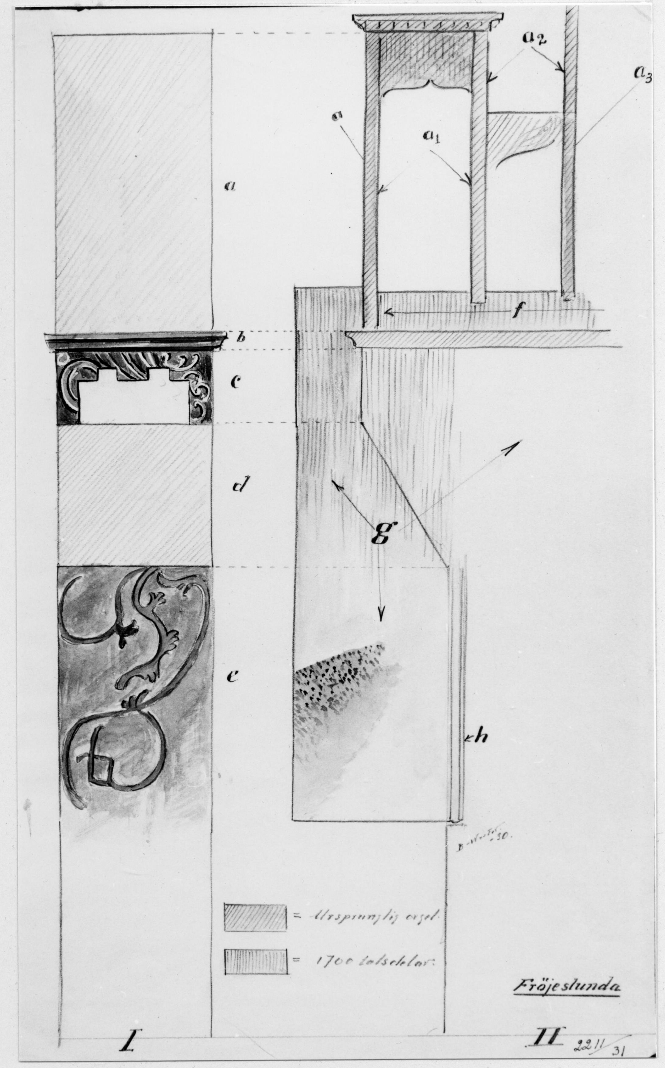 Beskrivning: Orgel, delvis från 1520-talet, i huvudsak av Daniel Stråhle, 1730-talet, detalj. Foto efter teckning av Bertil Wester 1930.
