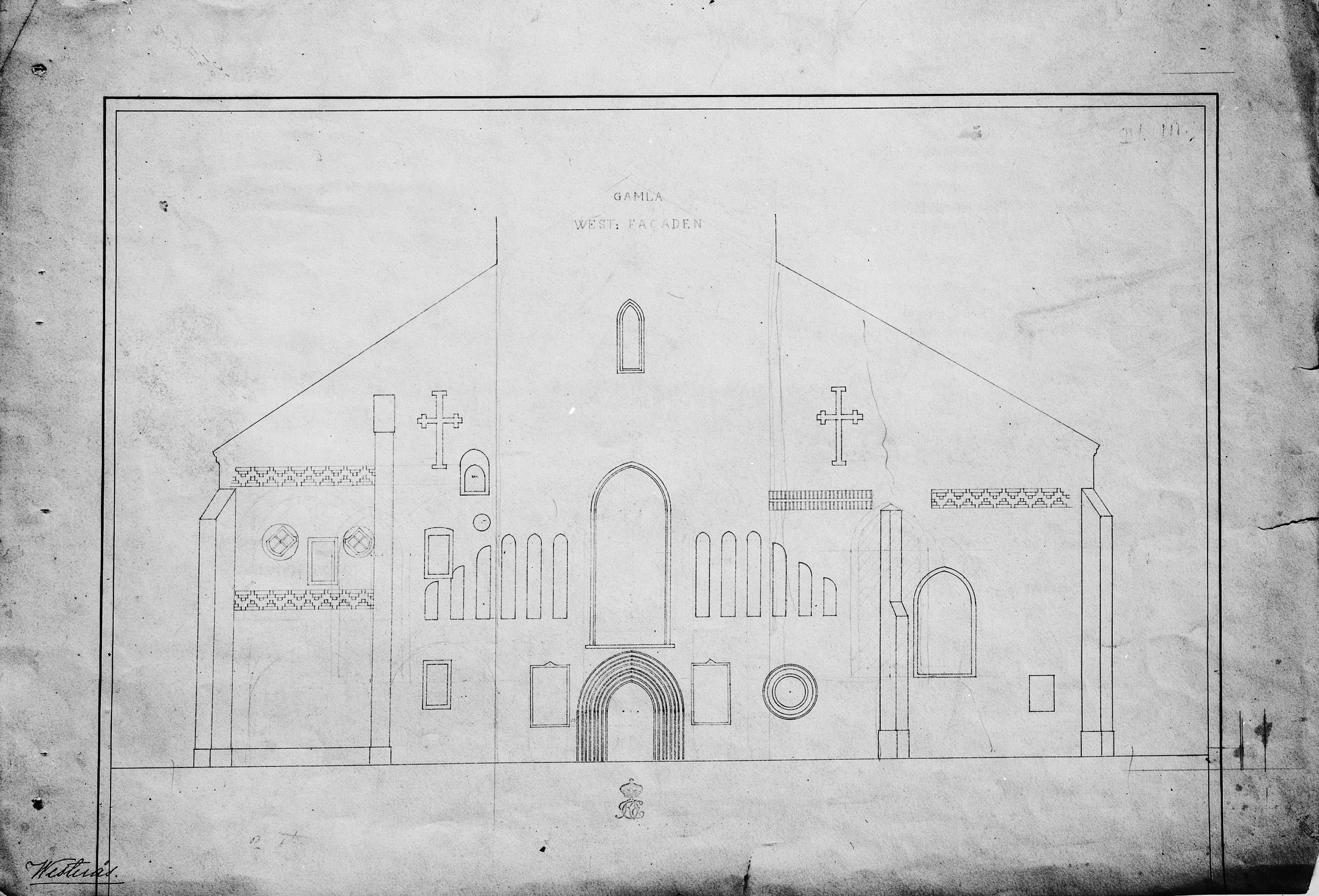 Beskrivning: Ritning. Gamla västfasaden, 1849. Efter ritning i Kungl. Byggnadsstyrelsen.
