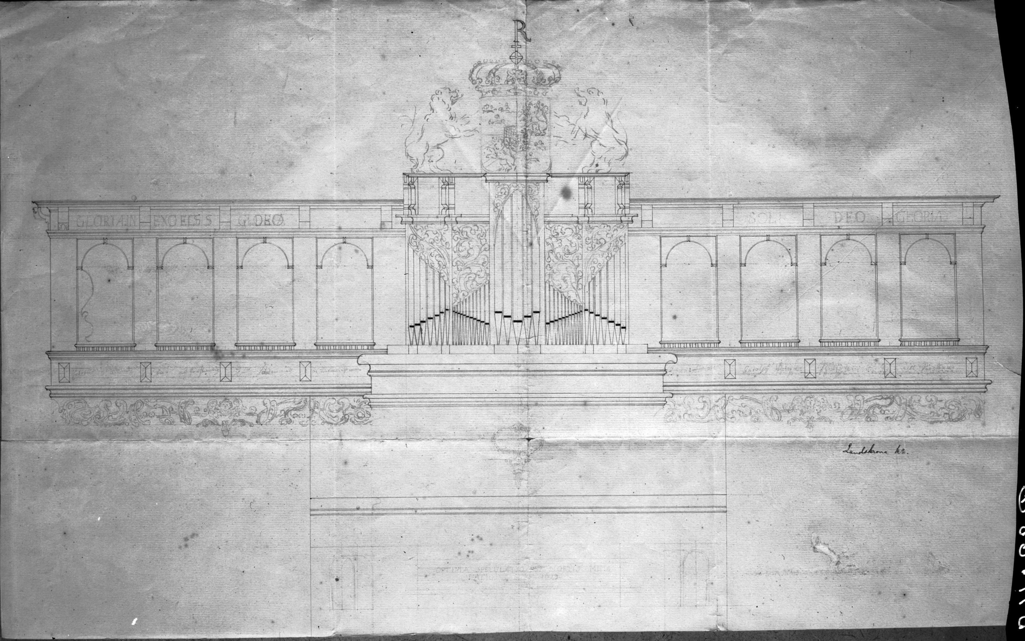 Beskrivning: Orgel. Foto av ritning. Original i Handteckningssamlingen, ATA.