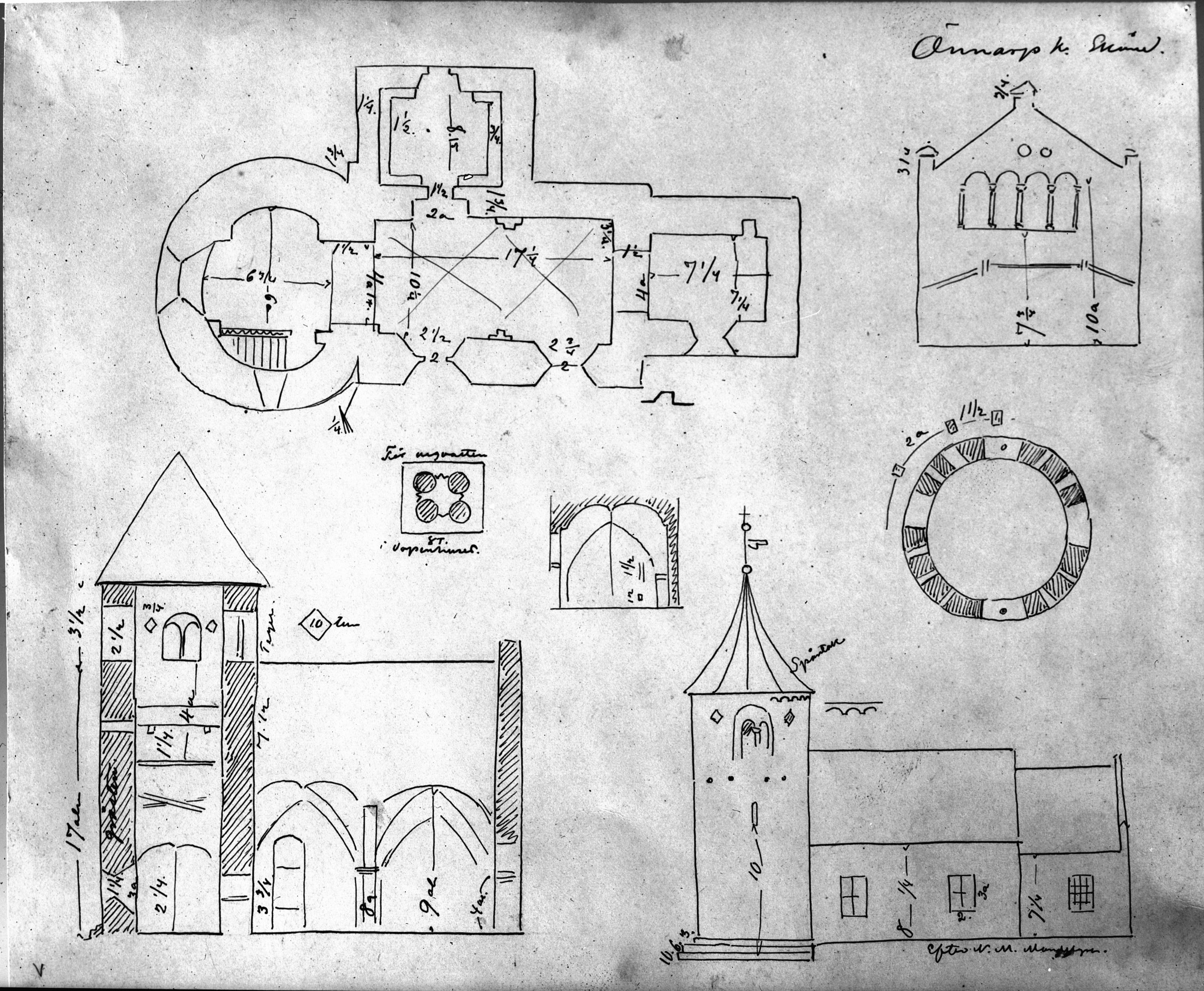 Beskrivning: Plan- fasad-, och detaljritning av kyrkan. Foto efter teckning i planscharkivet.