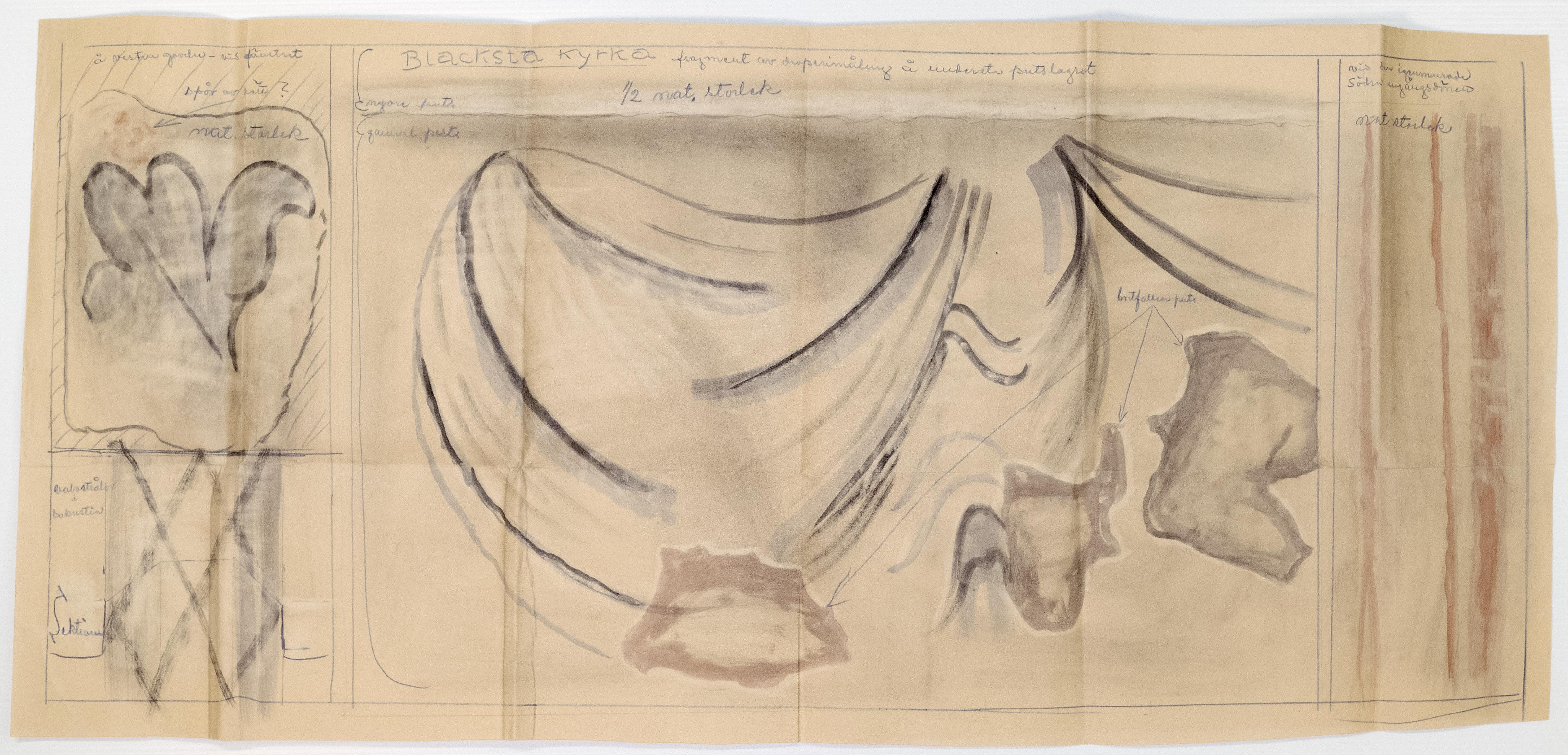 Beskrivning: Spår av kalkmåleri från 1700-talet, påträffade 1929. Akvarell av målarmästare Mauritz Ekholm från samma år.