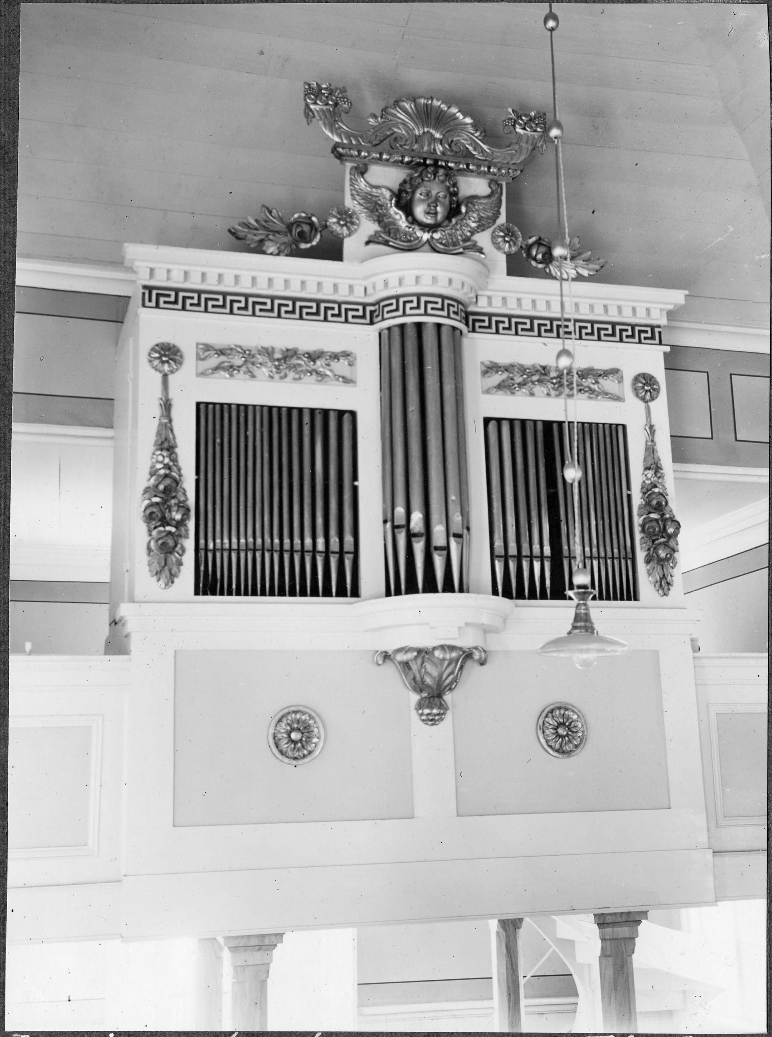 Beskrivning: Orgel, 1853, fasaden delvis tillverkad av delar av Kristine kyrkas gamla orgelfasad från 1799.