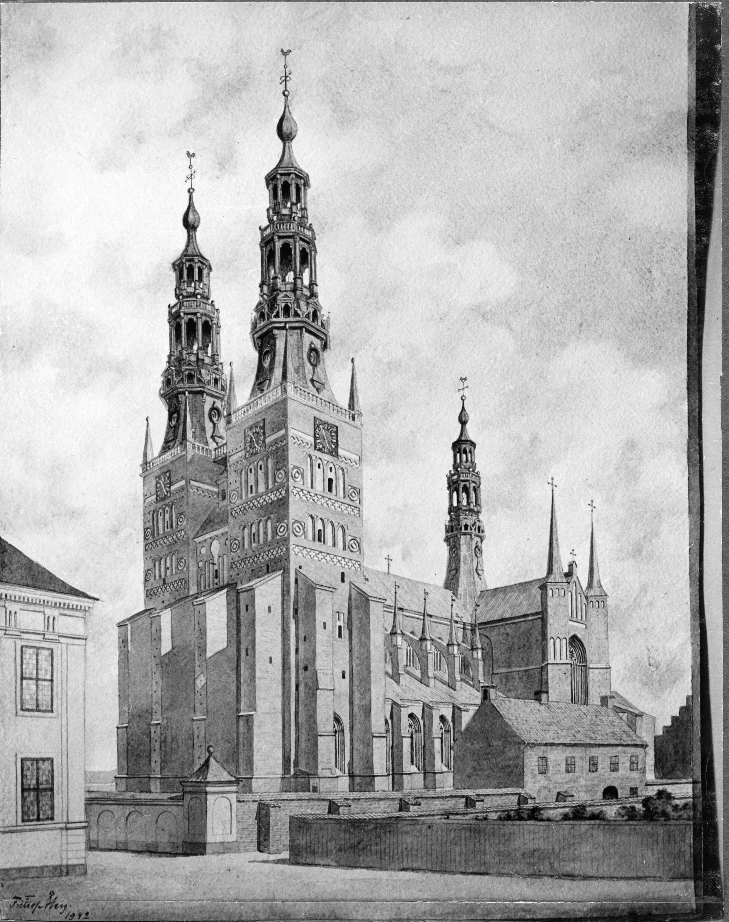 Beskrivning: Kyrkan mot sydväst under 1600-talet, före 1702 års brand. Rekonstruktion och teckning utförd av Fritiof Åberg 1942. Avfotograferad.