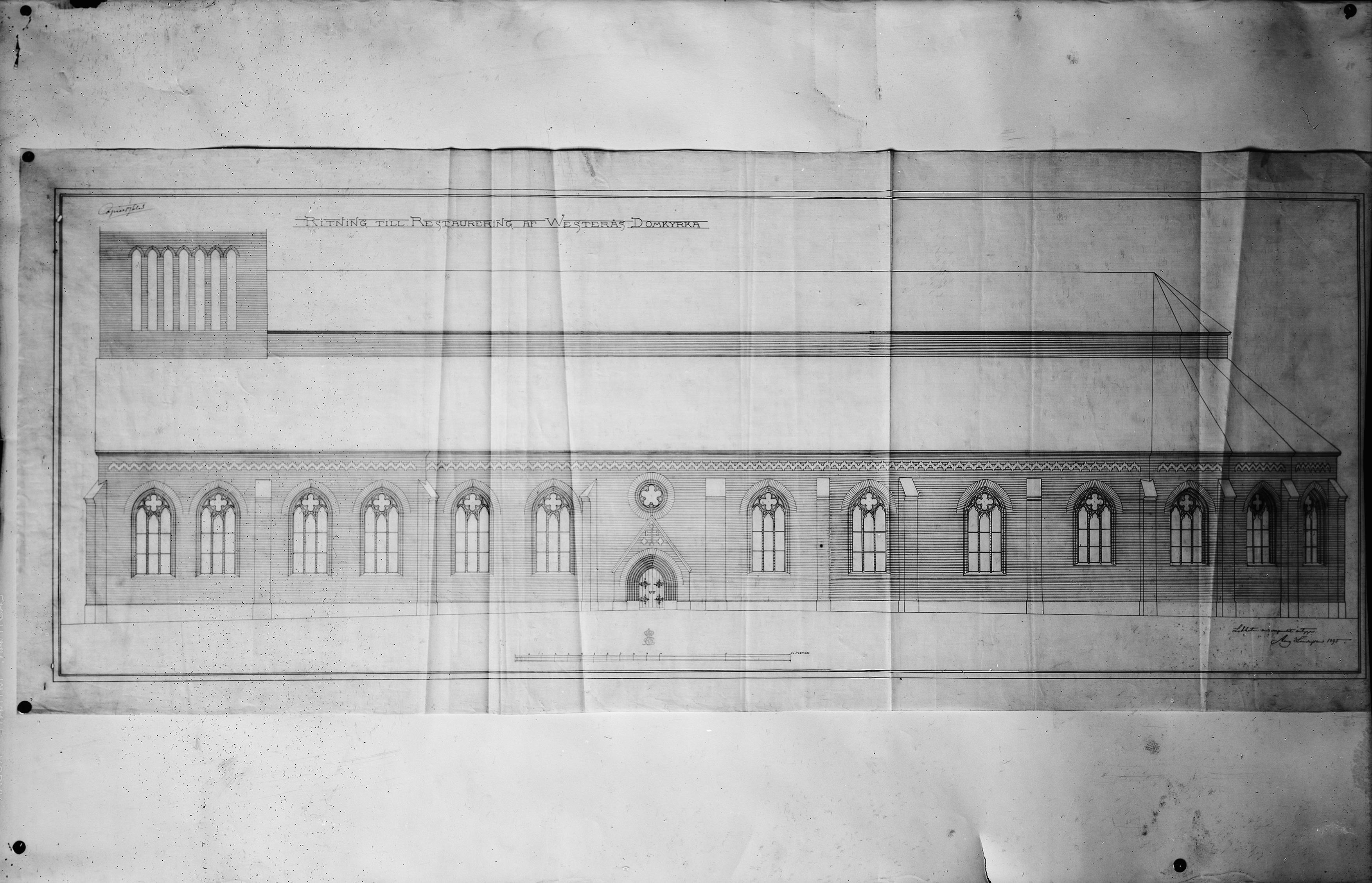 Beskrivning: "Ritning till restaurering av Westerås Domkyrka". Efter ritning i Kungl. byggnadsstyrelsen.