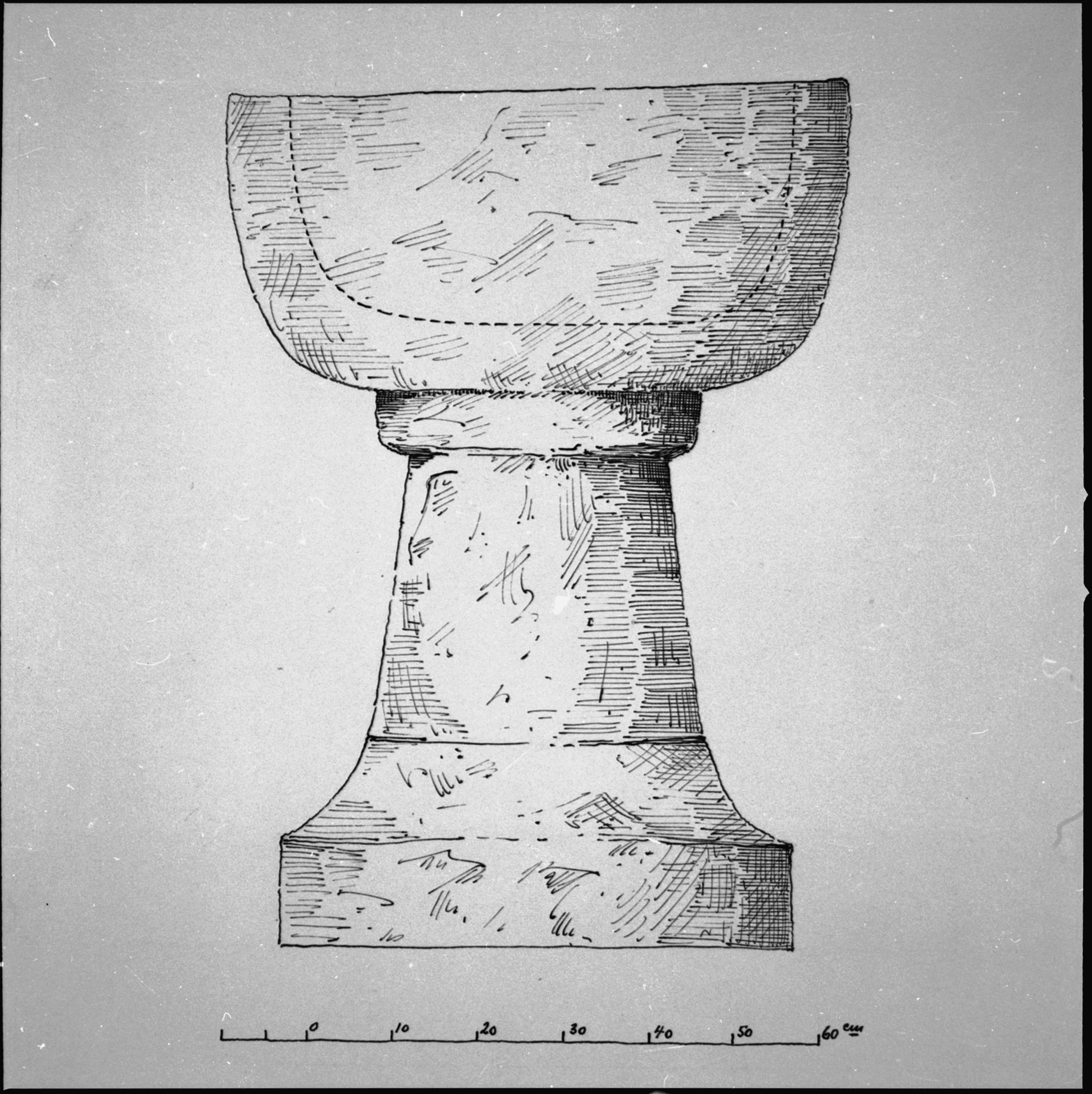 Beskrivning: Foto av uppmätning av Henrickson Hansen. Dopfunt av röd gotländsk kalksten från 1300-talet. Orginal i Handteckningssamlingen, ATA.