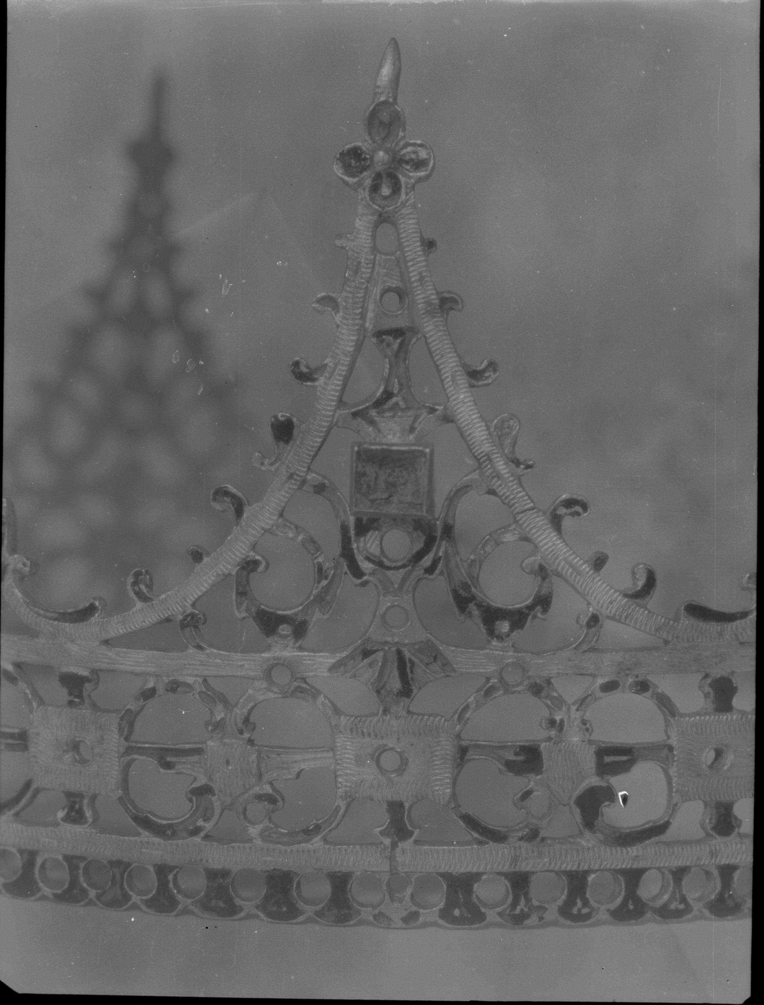 Beskrivning: Brudkrona, silver, helförgylld. Detalj.