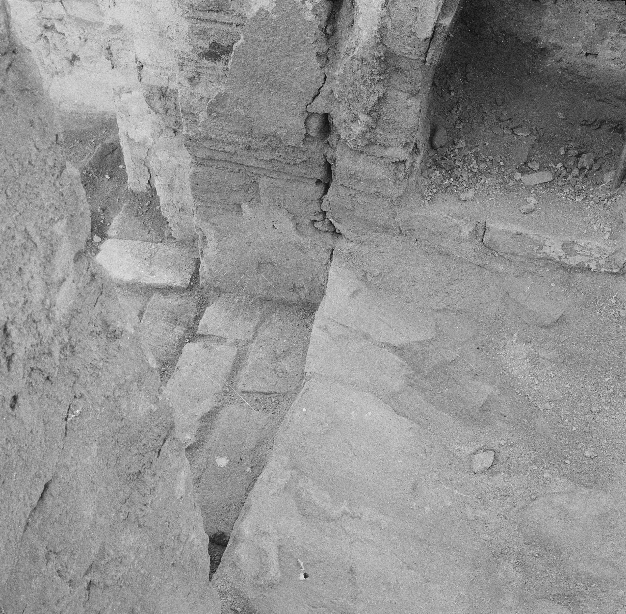 Beskrivning: Under restaureringen: vid altaret mot norr, rester av golv väster om skräckmuren. Sett uppifrån mot sydöst.